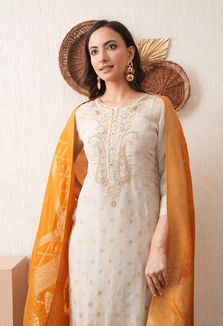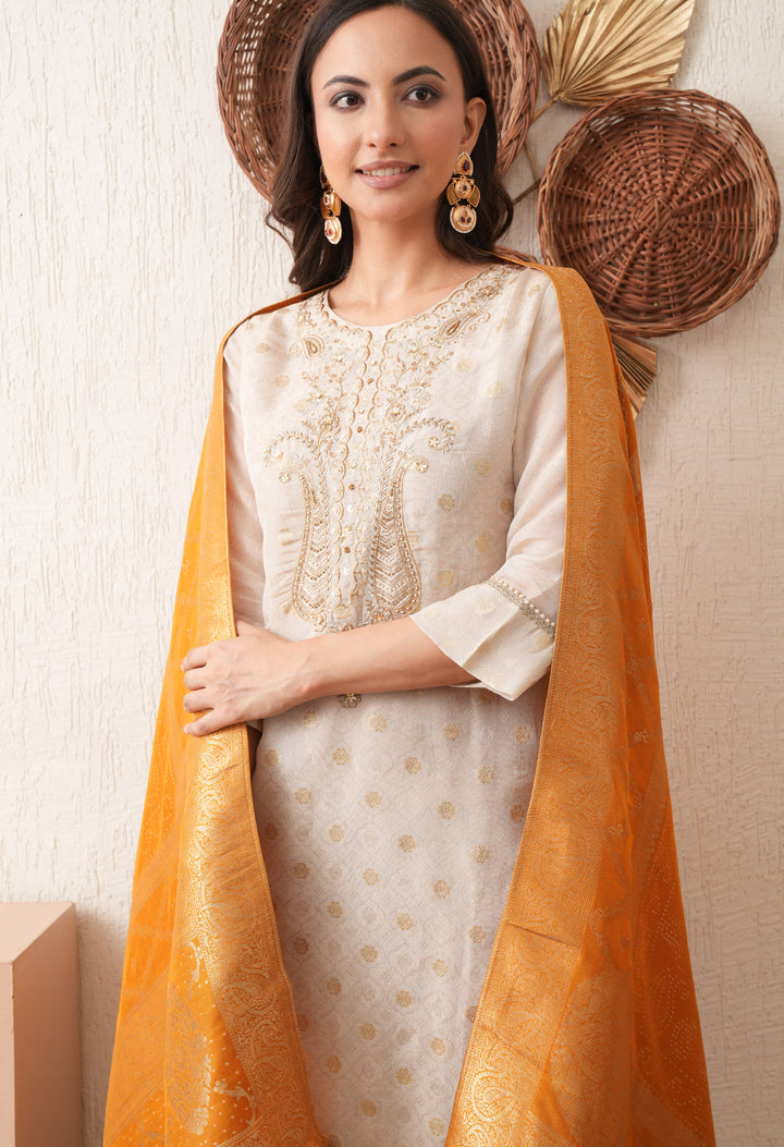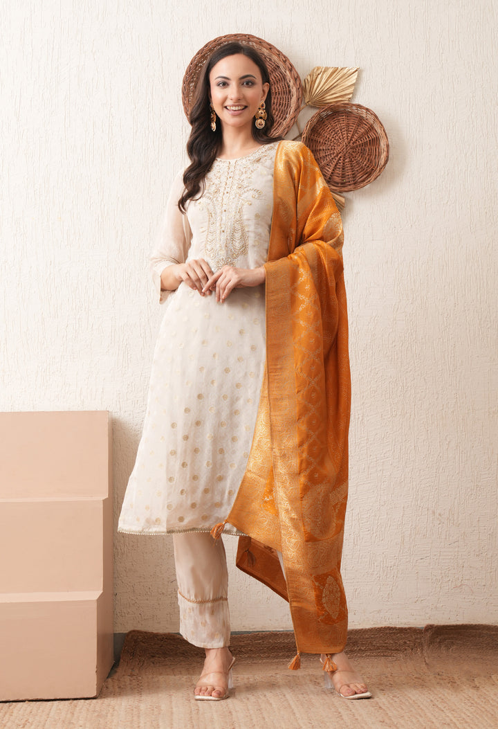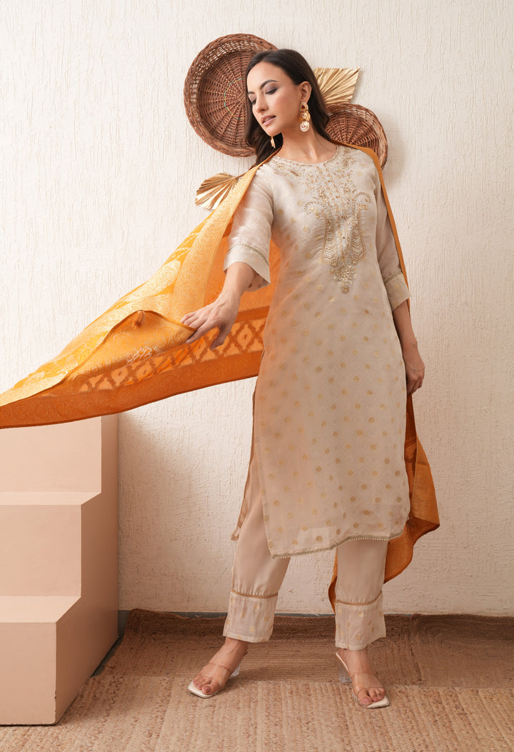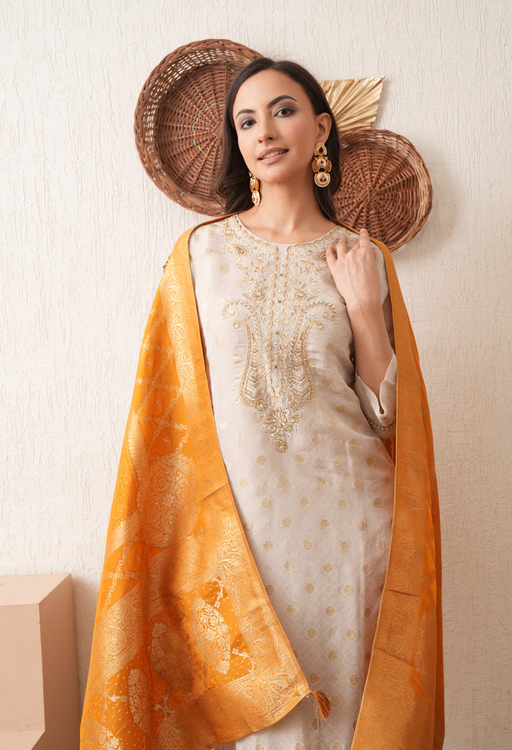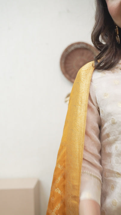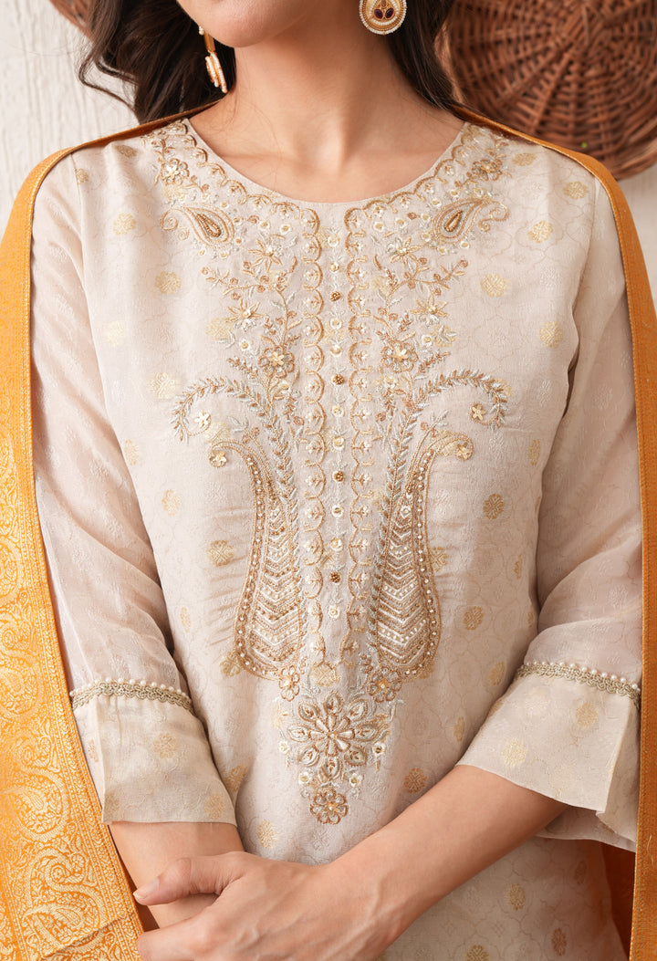 Step into timeless charm with our Beige Banarasi Zari Elegance Suit, crafted for semi-formal occasions. Designed in premium Banarasi fabric with intricate zari and sequin work, it exudes rich traditional allure. The 3/4th sleeves adorned with delicate pearl detailing and a round neckline add feminine grace, while the Banarasi scalloped pant hem brings a regal touch. Paired with a metallic Banarasi silk dupatta, this ensemble blends sophistication with heritage beauty.