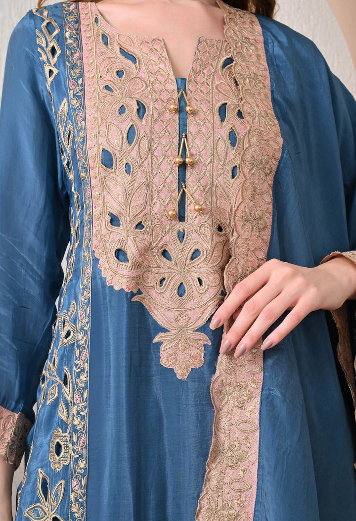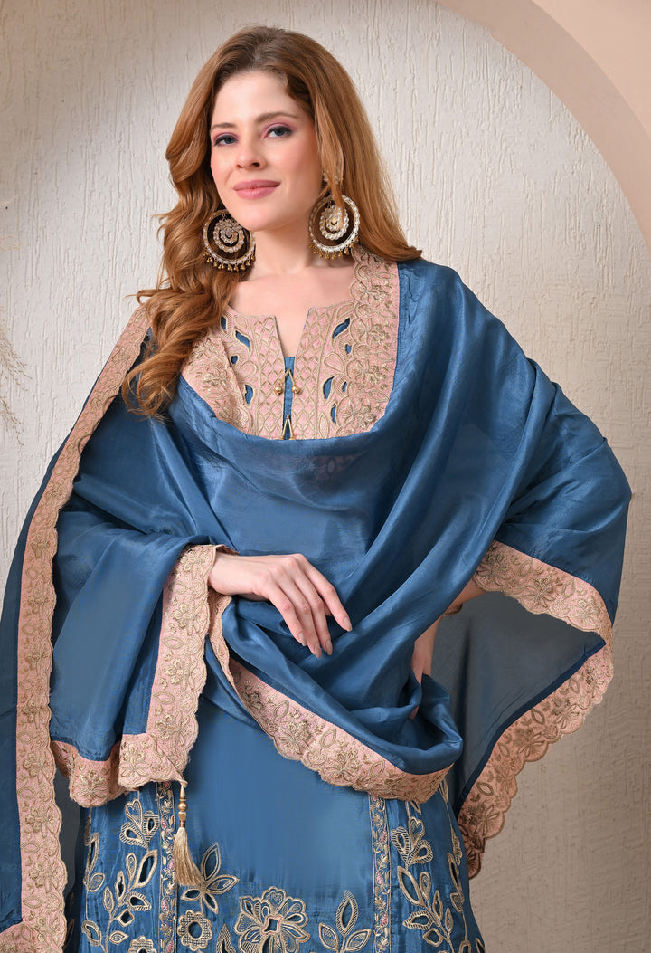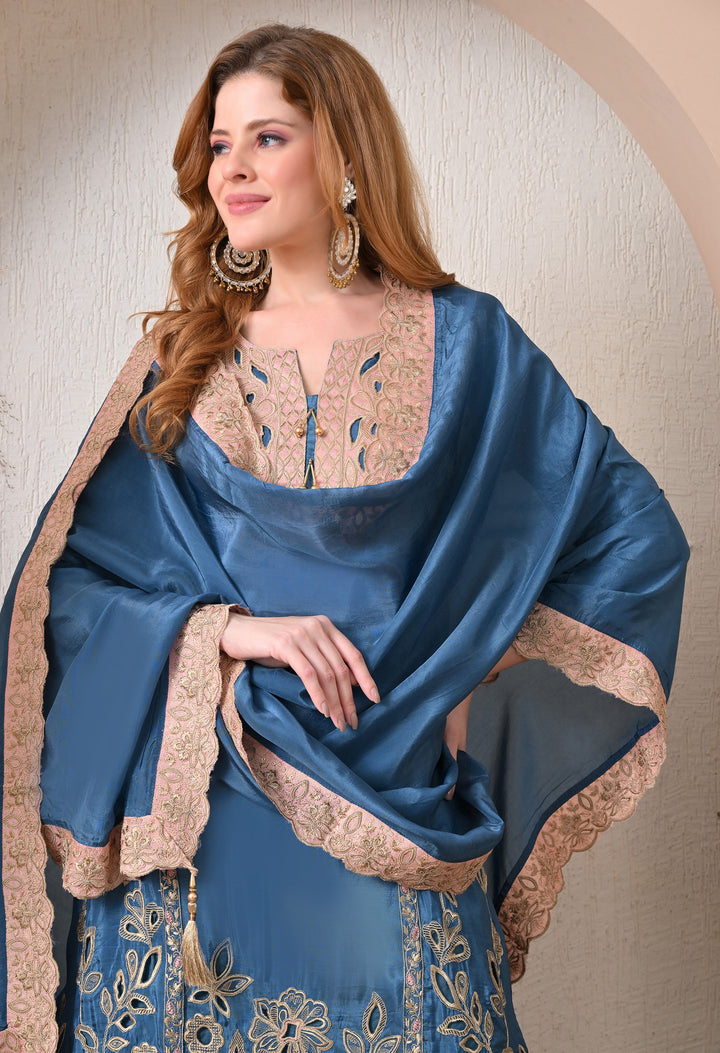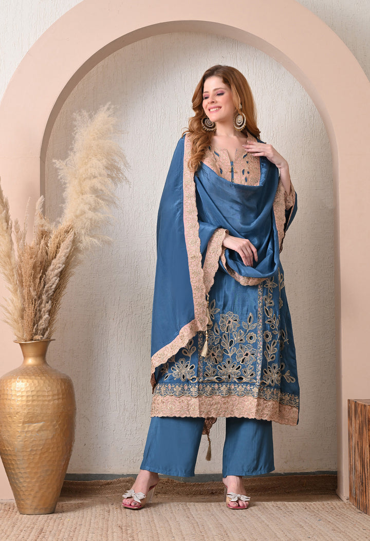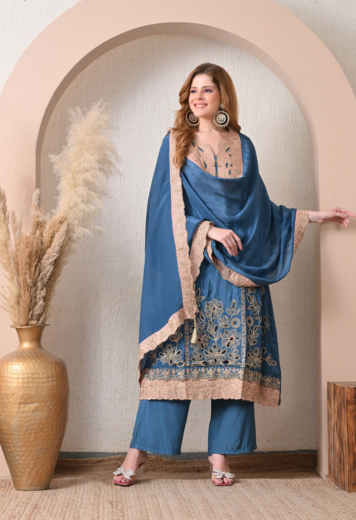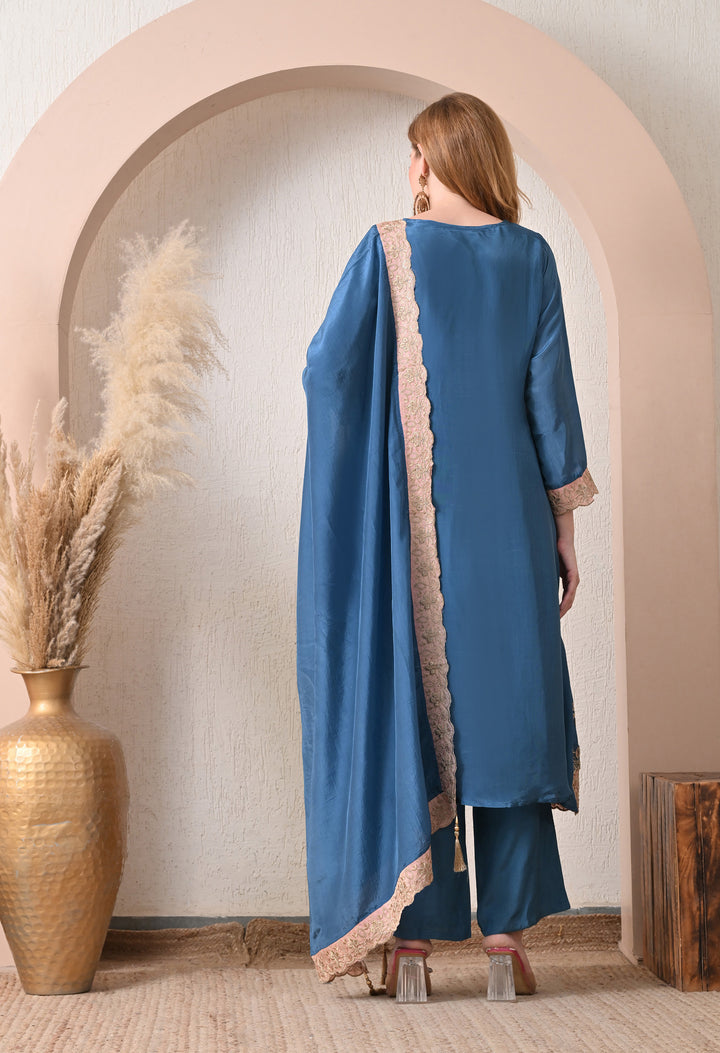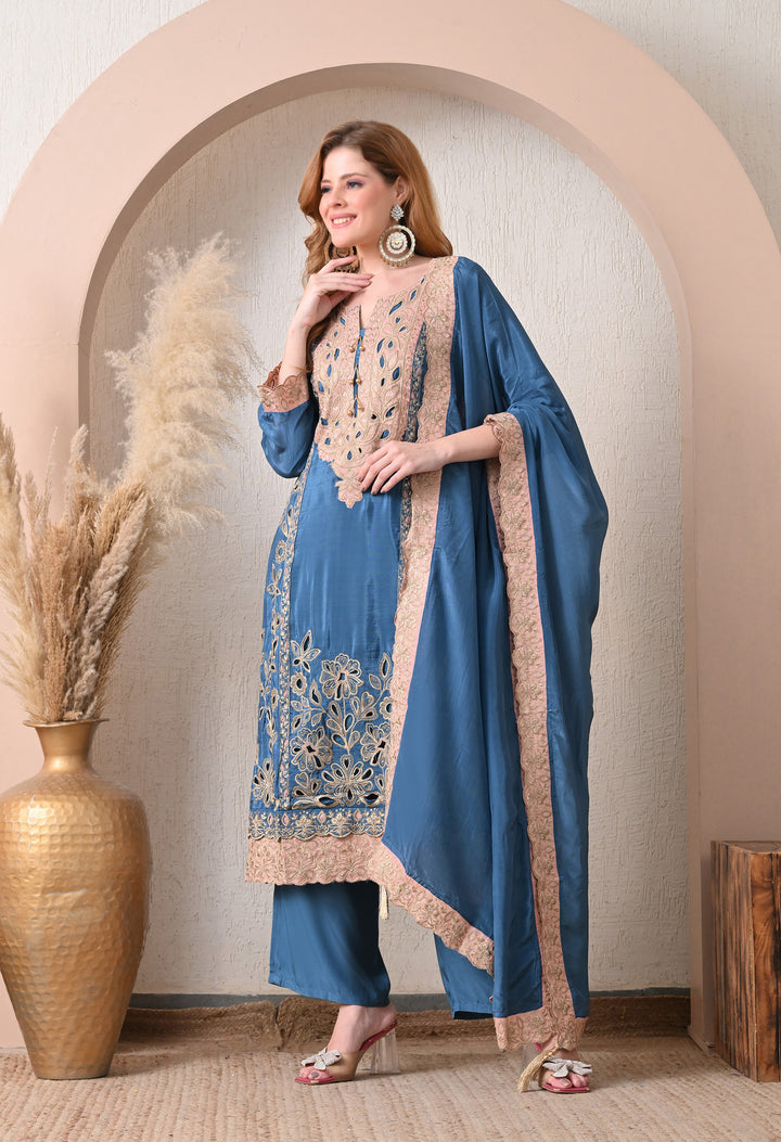 Shine at every occasion in this stunning blue party suit. Crafted from pure crepe with lining, it features elegant schiffli, zari, and thread work. The round-neck top with full sleeves pairs perfectly with matching pants, while the crepe dupatta with side tassels adds a playful, stylish touch.