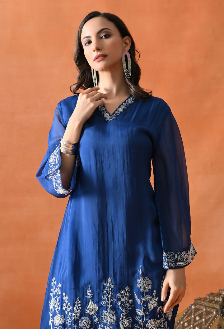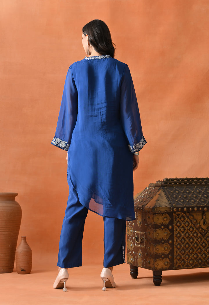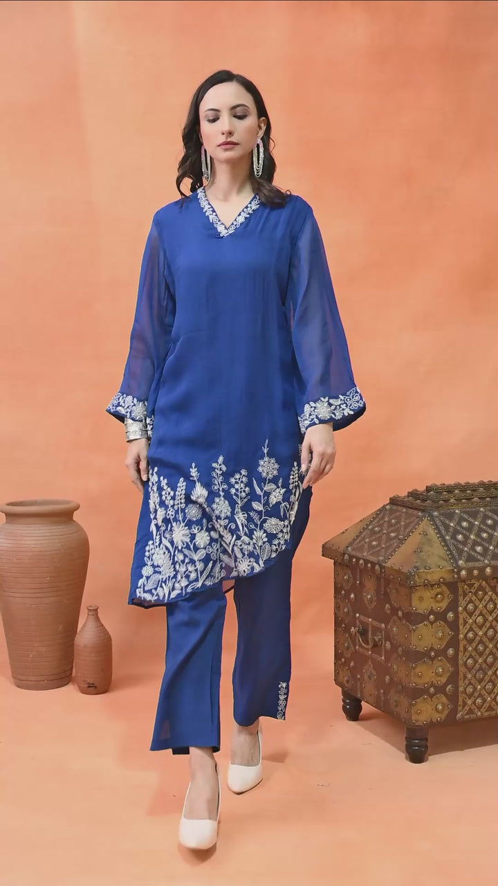 Get ready to look gorgeous in this stylish diagonal cut co-ord set in a lovely blue shade. Made from soft organza crepe with full lining, it feels super light and comfy. The beautiful pearl and thread work make it look classy and festive. The full sleeves with umbrella-style design add a graceful touch, and the V-neck keeps it trendy. The pants come with one side pocket—perfect for your phone or lip balm! Whether it’s a party or family function, this outfit will make you shine and stand out with its pretty and modern design.