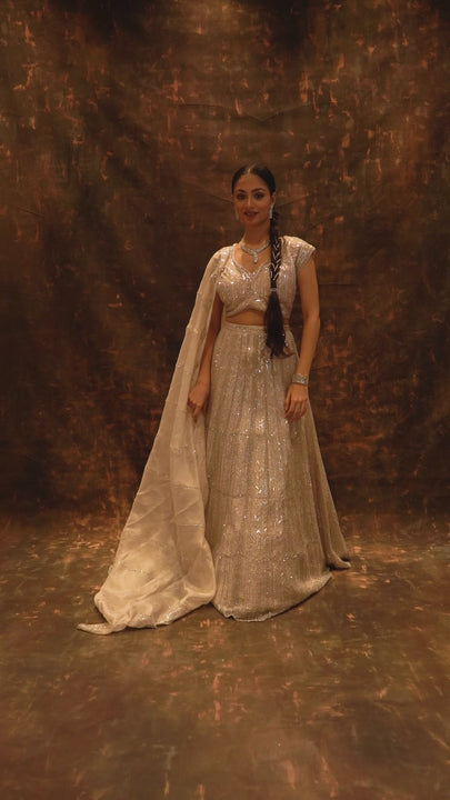 Dazzle on your special day with our Blush Radiance Nude Pink Lehenga Set. Crafted from premium organza, this stunning ensemble features intricate sequin and cutdana embellishments in a mesmerizing chevron pattern. The sweetheart-neck cap-sleeve blouse adds a touch of grace, while the scalloped dupatta with embroidered detailing completes the ethereal look. Lined with soft santoon and layered with can-can, it offers both comfort and a grand, voluminous flair - perfect for your engagement or reception.