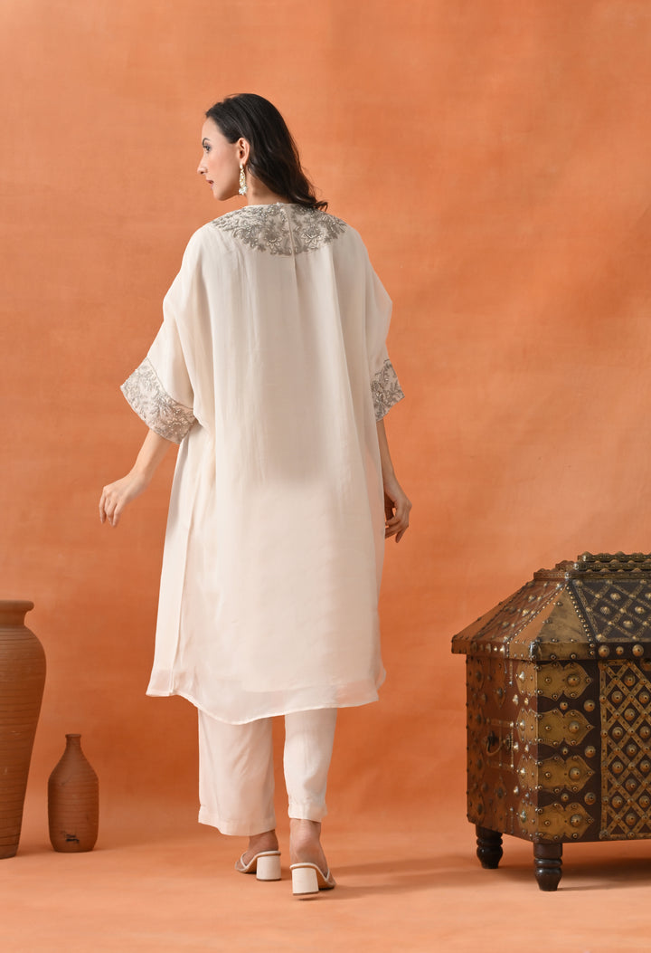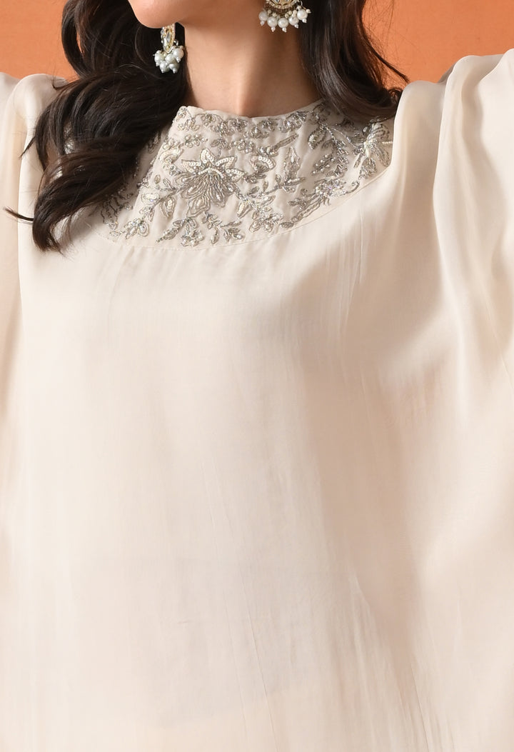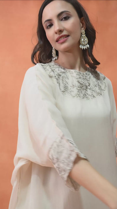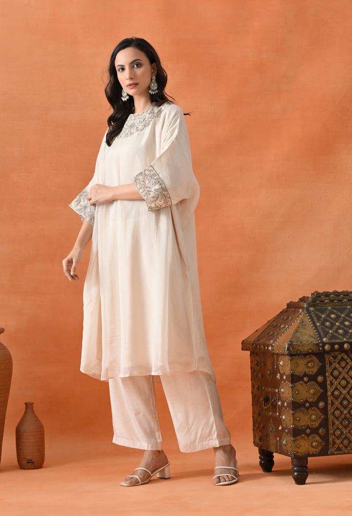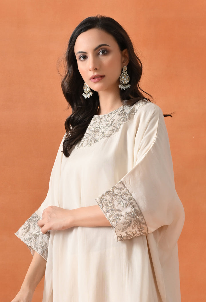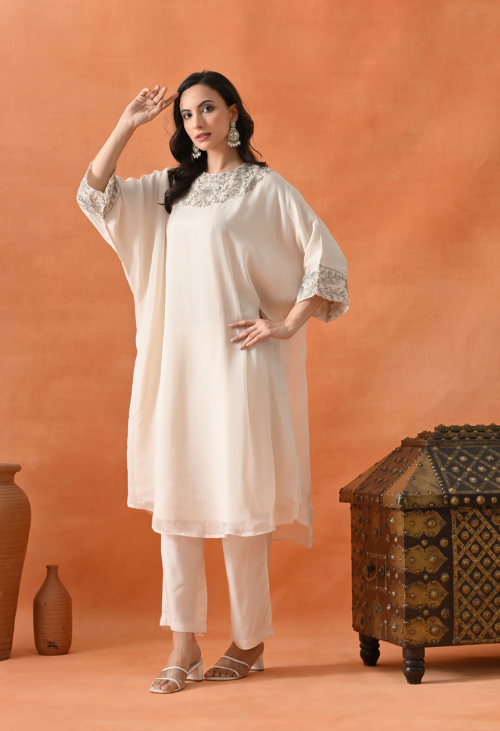 Step into elegance with this beautiful cream kaftan set that’s made to make you shine! Crafted in soft organza crepe, it feels light and looks super stylish. The kaftan has a soft lining for comfort, while the pants are unlined with a handy one-sided pocket. Delicate pearl, sequins, and zari work all over add a magical sparkle. The round neck and half sleeves keep it classy yet comfy. Perfect for festive events, family gatherings, or evening outings, this outfit will make everyone ask, “Where did you get it from?”
