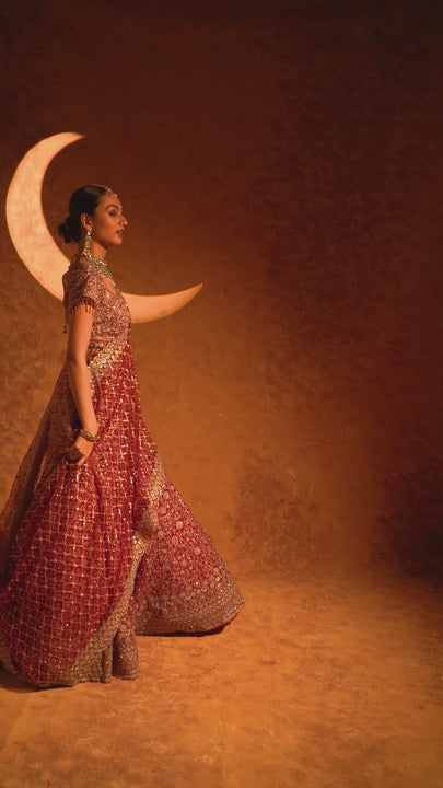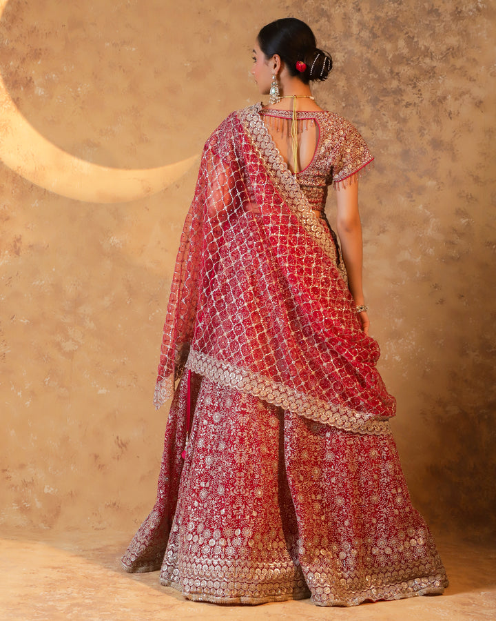 Step into elegance with our Crimson Sparkle Indo-Western Lehenga, a radiant creation in deep red that embodies luxury and grace. Crafted from soft net fabric, this lehenga features intricate siroski and sequin embellishments that shimmer with every move. The sweetheart neckline and cap-sleeved blouse enhance its feminine charm, while the sheer net dupatta with a delicately worked border adds the perfect finishing touch. Ideal for engagement evenings, receptions, or festive celebrations, this outfit blends traditional beauty with modern sophistication.