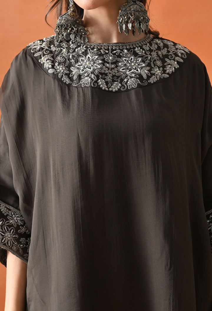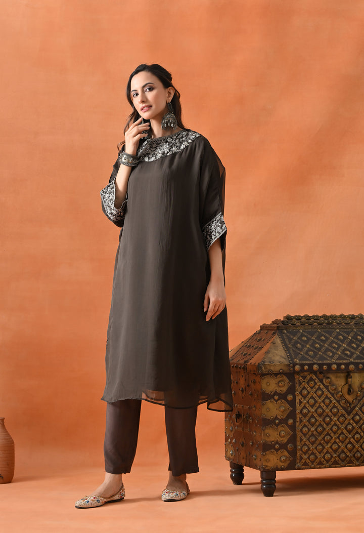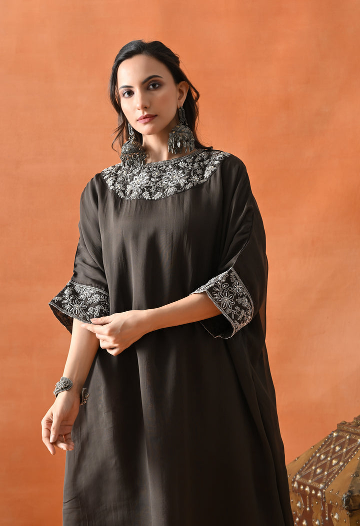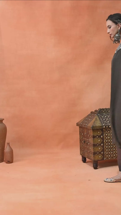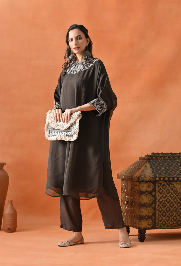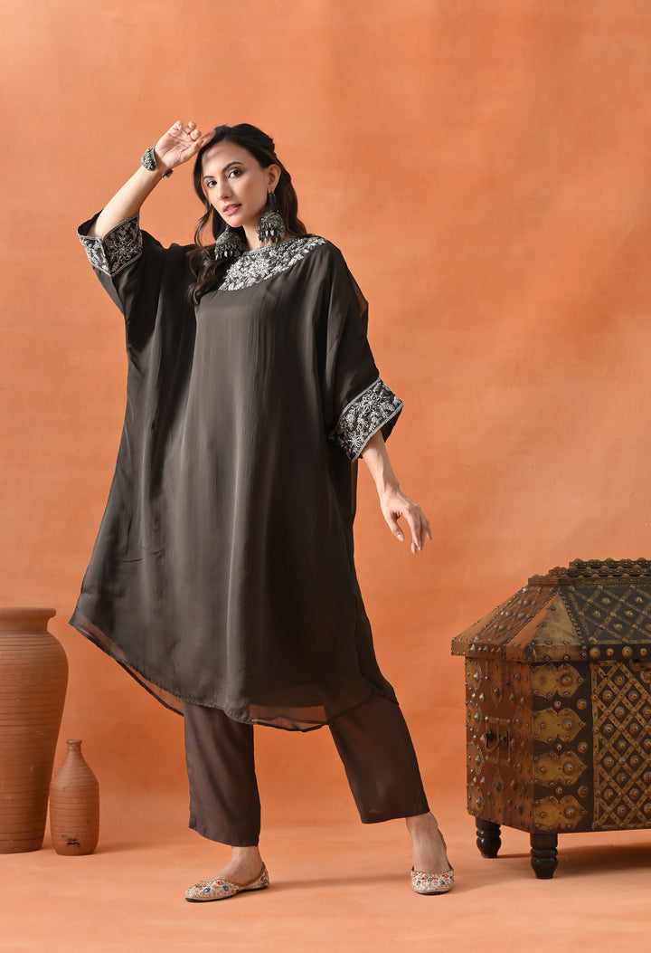 This dark brown kaftan suit is made from soft cotton, perfect for all-day comfort. It shines beautifully with pearl, sequins, and zari work, making it a great choice for special occasions. The half sleeves and round neck add a simple yet elegant touch. The pants have a handy one-sided pocket and no lining, keeping the look light and easy. With lining in the suit, it feels smooth and comfortable to wear. This suit is stylish and perfect for anyone who wants to look classy and feel cozy. Don't miss out—grab this beautiful outfit now!