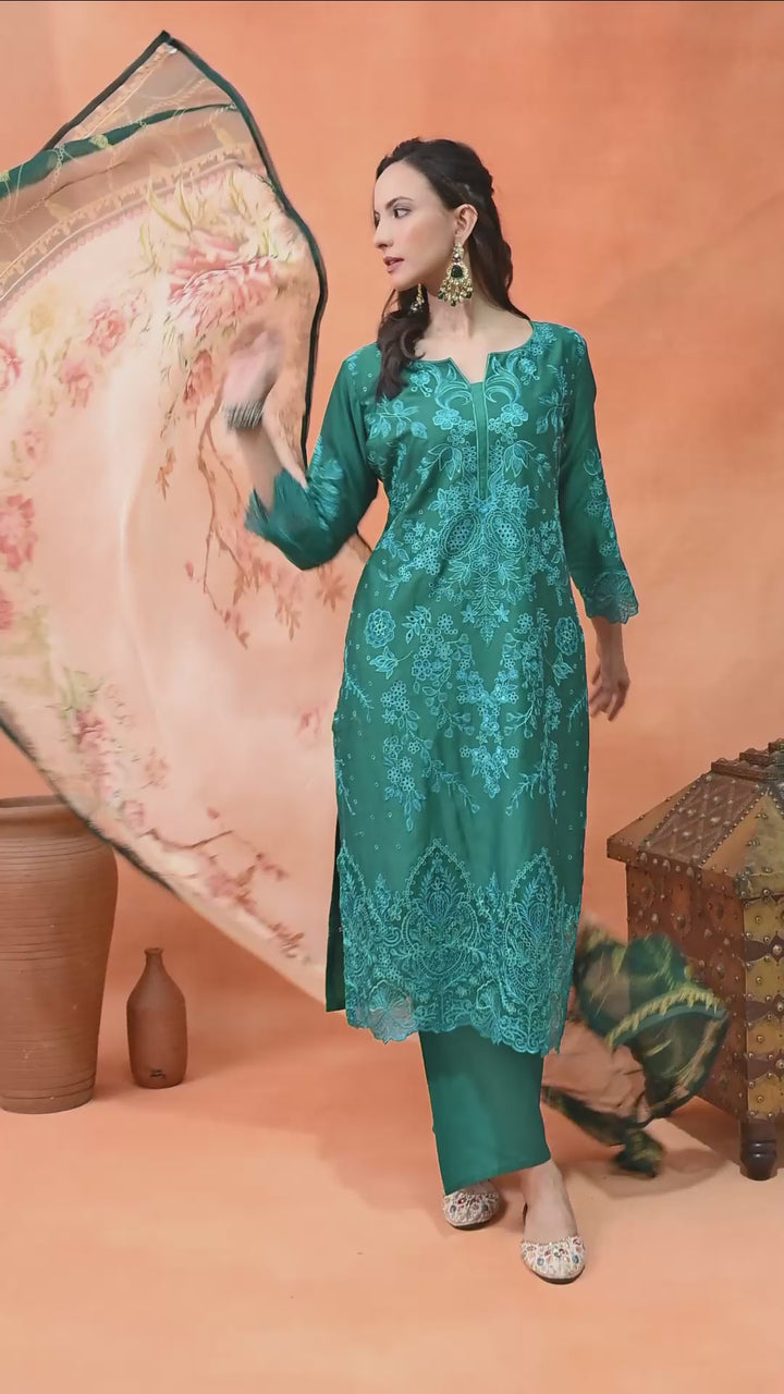 This dark green Pakistani-style suit is a must-have for your everyday and festive wardrobe. Made from soft cotton fabric, it feels light and comfy all day. The suit features neat siply work and a stylish round neck with a V-cut that adds a touch of elegance. It comes with 3/4 sleeves and a matching pant for a sleek look. The cream-based floral printed dupatta adds the perfect hint of grace and freshness. Whether it’s a family function or a casual outing, this outfit will make you feel beautiful instantly!