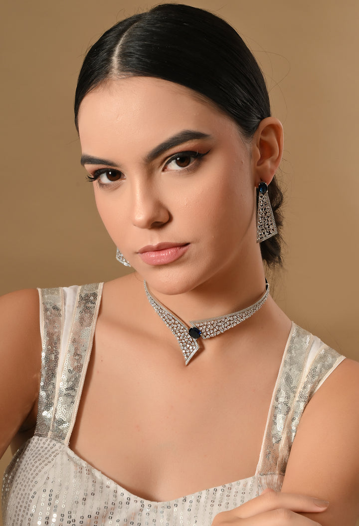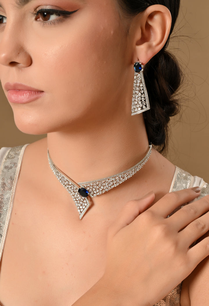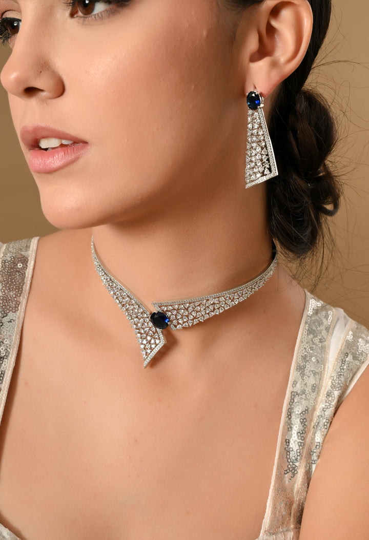 Introducing the Elegant Sapphire Sparkle Jewelry Set, a dazzling combination of a stunning choker and glamorous earrings. The exquisite silver design features a captivating sapphire stone that shines like the night sky. Perfect for special occasions or adding sparkle to your everyday look, this beautiful set will make you feel like a star. The eye-catching details and elegant style ensure you will turn heads wherever you go! Don’t miss your chance to own this dazzling jewelry set that adds charm and sophistication to any outfit. Get yours today and shine brighter than ever!