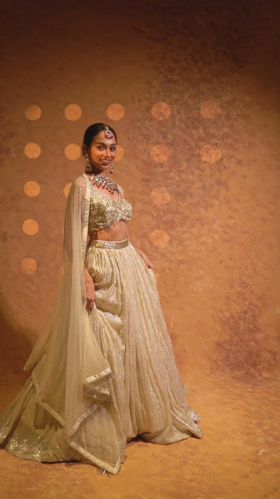 Step into timeless grace with our Ethereal Elegance White Indo-Western Lehenga Set. Crafted in luxurious cinon crepe, this ensemble blends traditional charm with modern flair. The V-neck blouse adorned with exquisite dabka handwork pairs beautifully with a sequined skirt that sparkles with every move. A soft net dupatta with delicate border detailing completes this radiant look. The crepe lining and can-can add volume and comfort, making it perfect for weddings, receptions, or festive occasions.