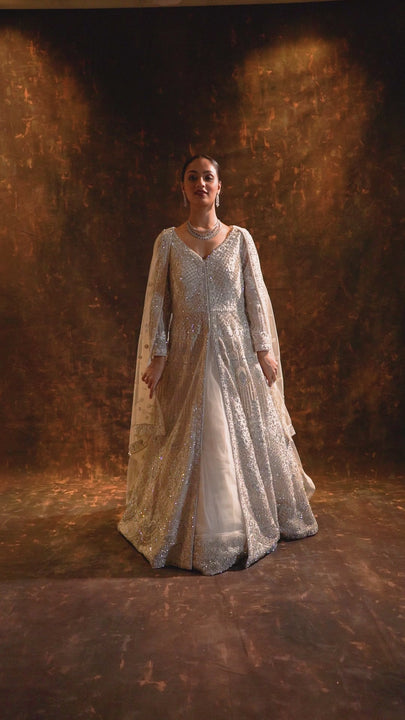 Radiate royal charm in our Ethereal Elegance Gown Lehenga, a mesmerizing blend of Indian heritage and modern sophistication. Crafted from luxurious net fabric, this gown features intricate zarkan and resham thread work that shimmers gracefully with every move. The V-deep neckline and full sleeves add a touch of allure, while the front-open long jacket enhances the regal silhouette. A delicate net dupatta with zarkan borders and tiki motifs completes this exquisite ensemble - perfect for engagement soirées and grand celebrations.