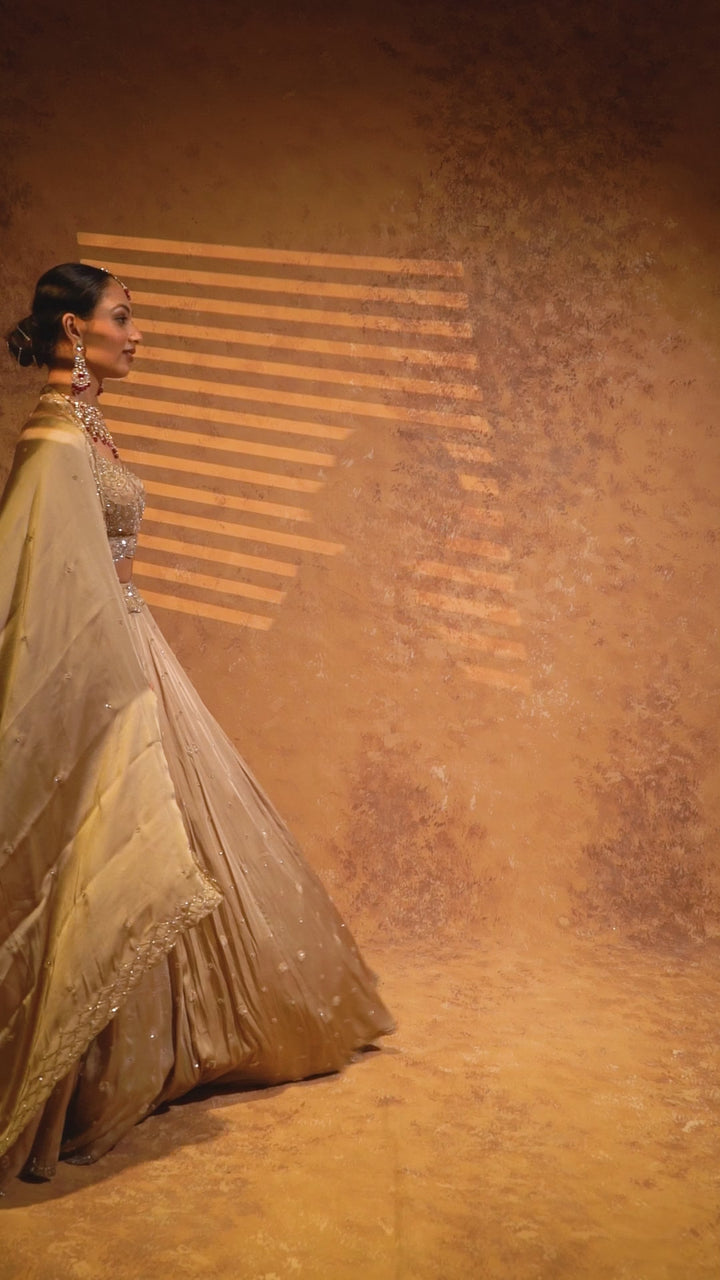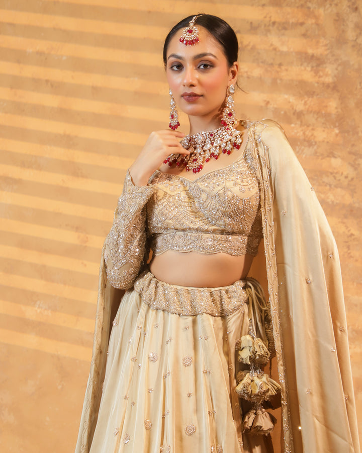 Embrace timeless elegance with our Golden Dusk Brown Indo-Western Lehenga Set, a luxurious creation crafted in premium Armani satin fabric. The ensemble features exquisite sequins and cattdana handwork that shimmer beautifully under any light. The sweetheart-neck full-sleeve blouse adds a touch of royal grace, while the matching dupatta in Armani satin adorned with handwork detailing and sequins completes the ensemble with understated glamour. Finished with a satoon lining and can-can for comfort and volume, this lehenga is a perfect choice for receptions, sangeet nights, and festive occasions.