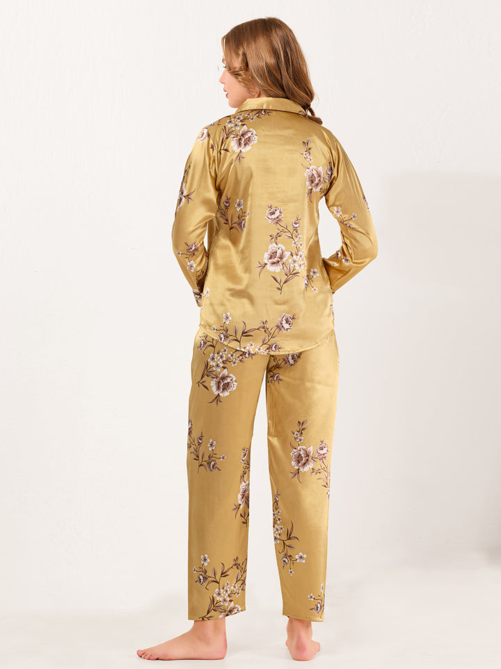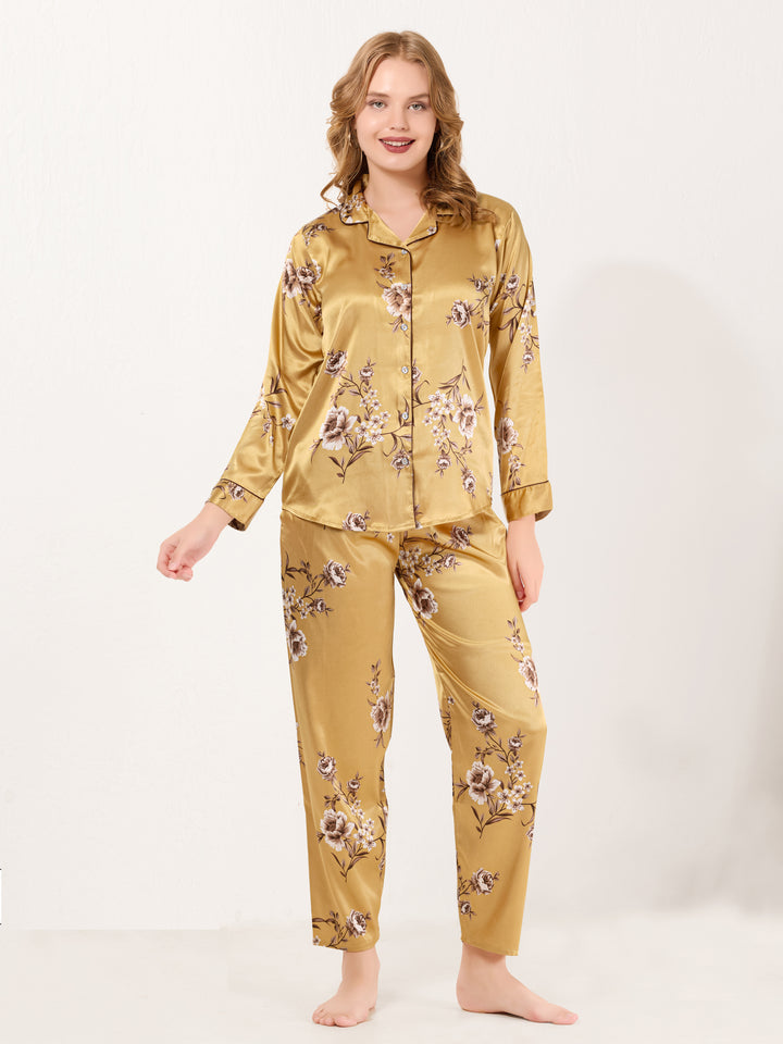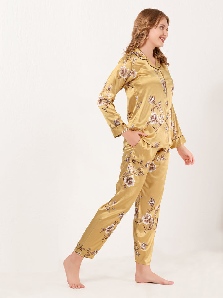Shine in effortless elegance with the Golden Grace Satin Pajama Set, featuring a rich golden hue adorned with delicate floral prints. Crafted from premium satin for a soft, silky feel, this set blends luxury and comfort perfectly — ideal for cozy evenings, lounging, or relaxed mornings in style.