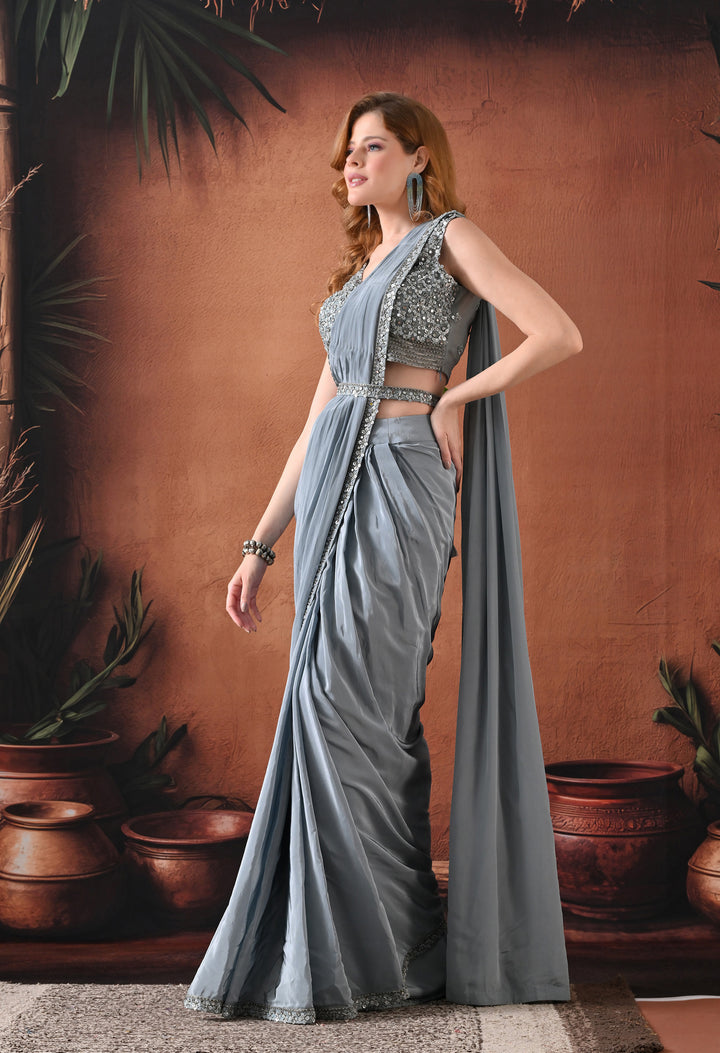 Turn heads in this elegant ready-to-wear drape saree, crafted in pure crepe with dazzling mirror, sequin, cut dana, and pearl work. Featuring a stylish V-neck padded blouse with cut sleeves and a chic waist belt, this grey beauty blends modern flair with timeless charm.