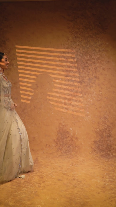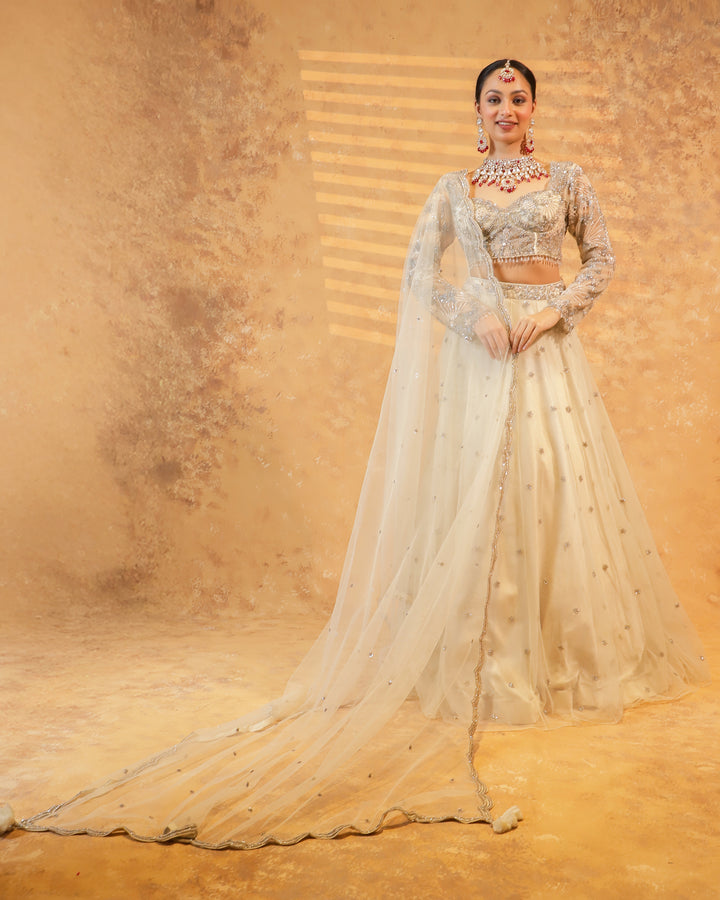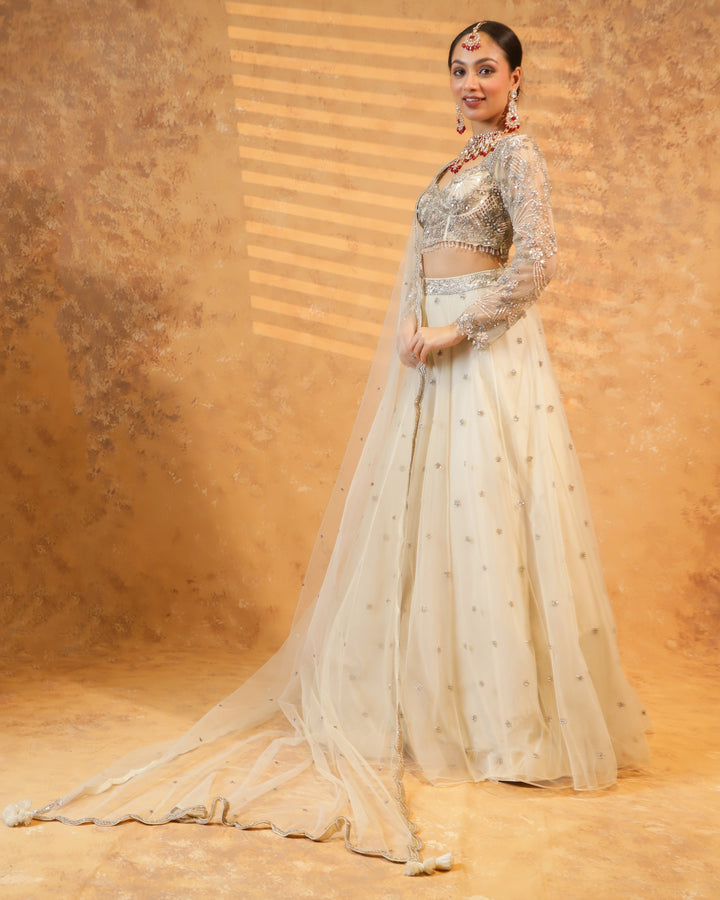 Radiate ethereal elegance in our Ivory Charm Off-White Indo-Western Lehenga Set, a perfect blend of sophistication and grace. Crafted in luxurious net fabric, the set features exquisite botty work on the skirt paired with a heavily embellished cutdana and sequins work blouse. The sweetheart cord neckline and full sleeves add a touch of classic charm, while the net dupatta with border and delicate booti accents completes this dreamy ensemble. Designed with crepe lining and can-can for comfort and structure, this lehenga is perfect for receptions, engagements, or elegant evening events.