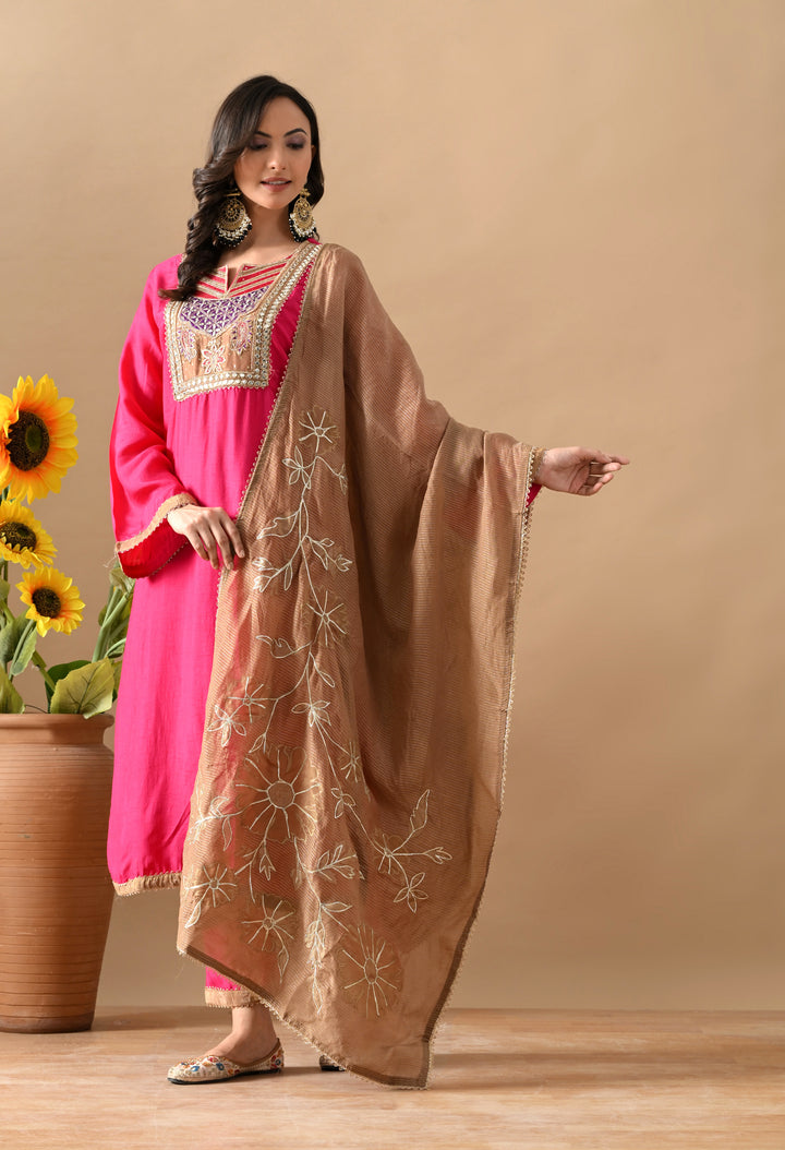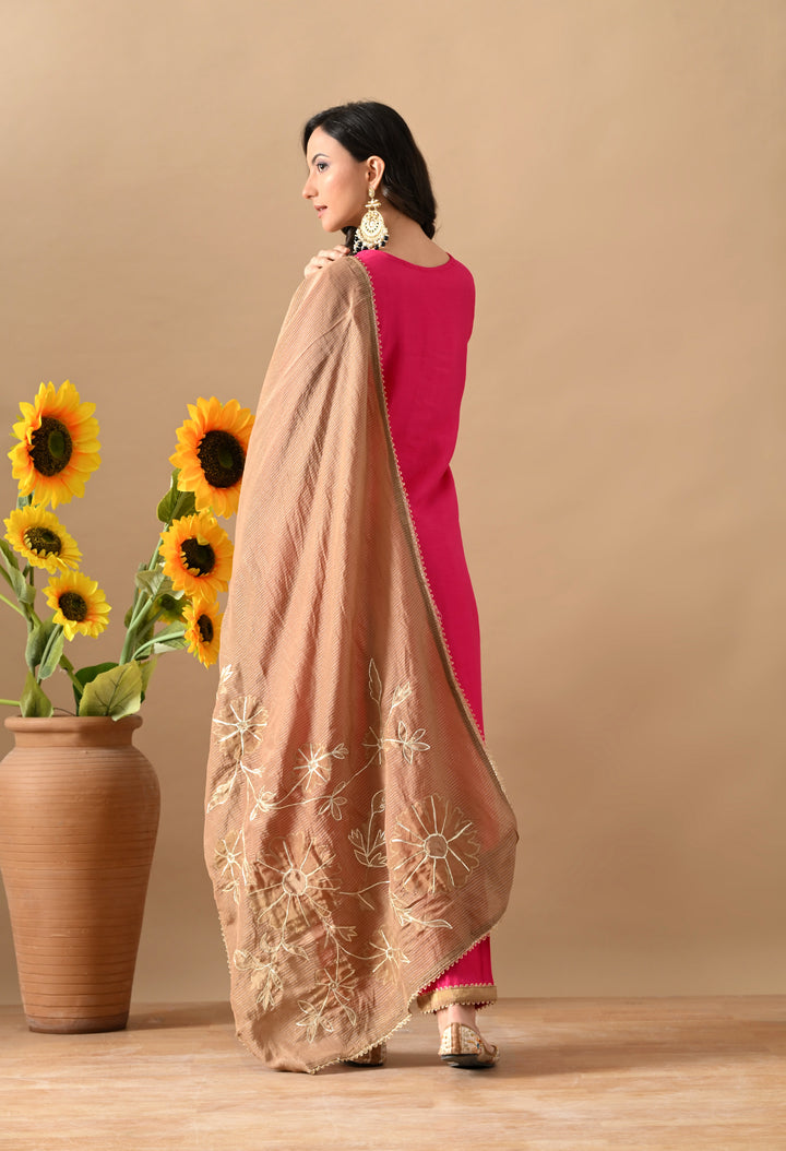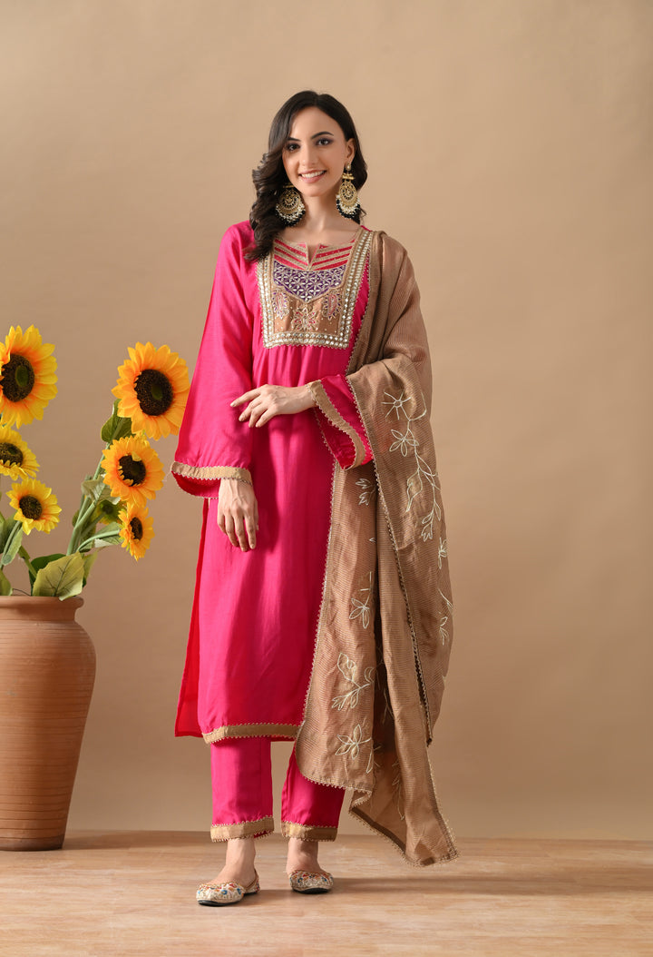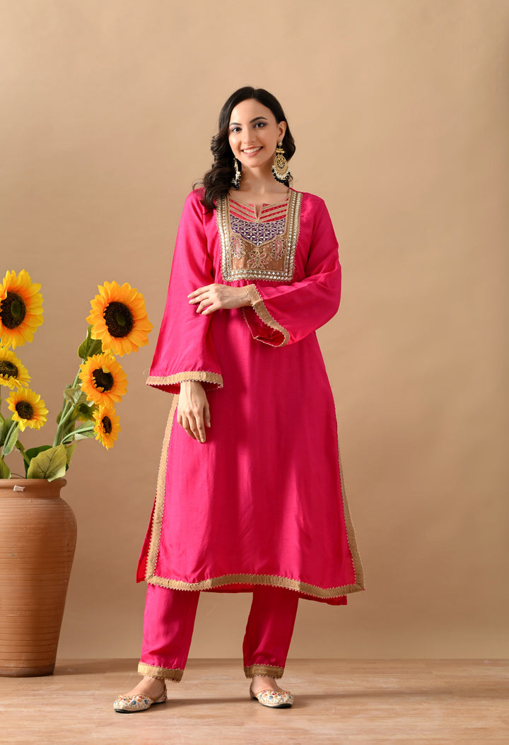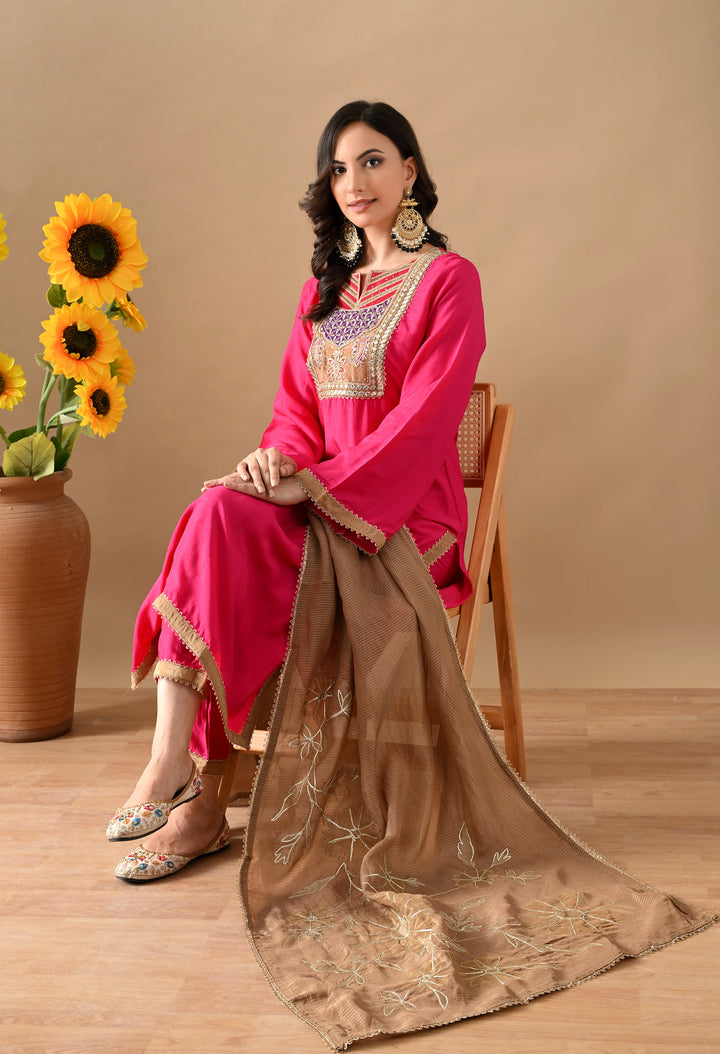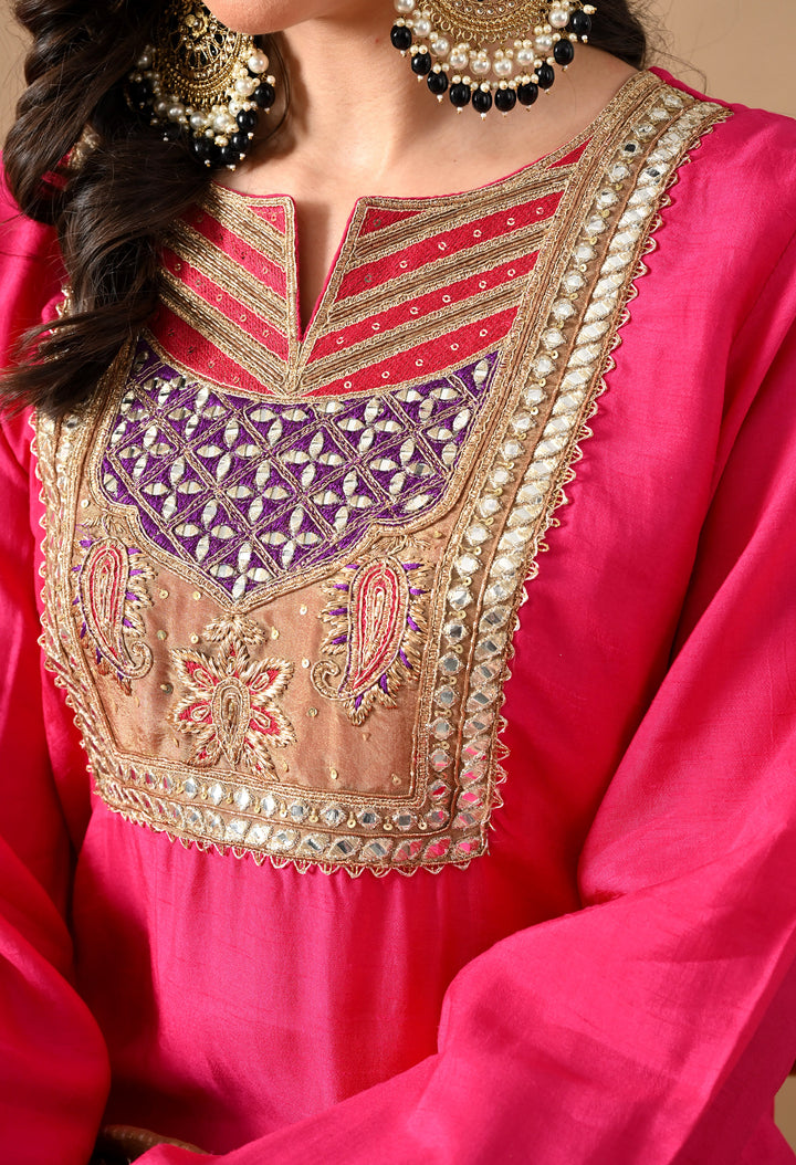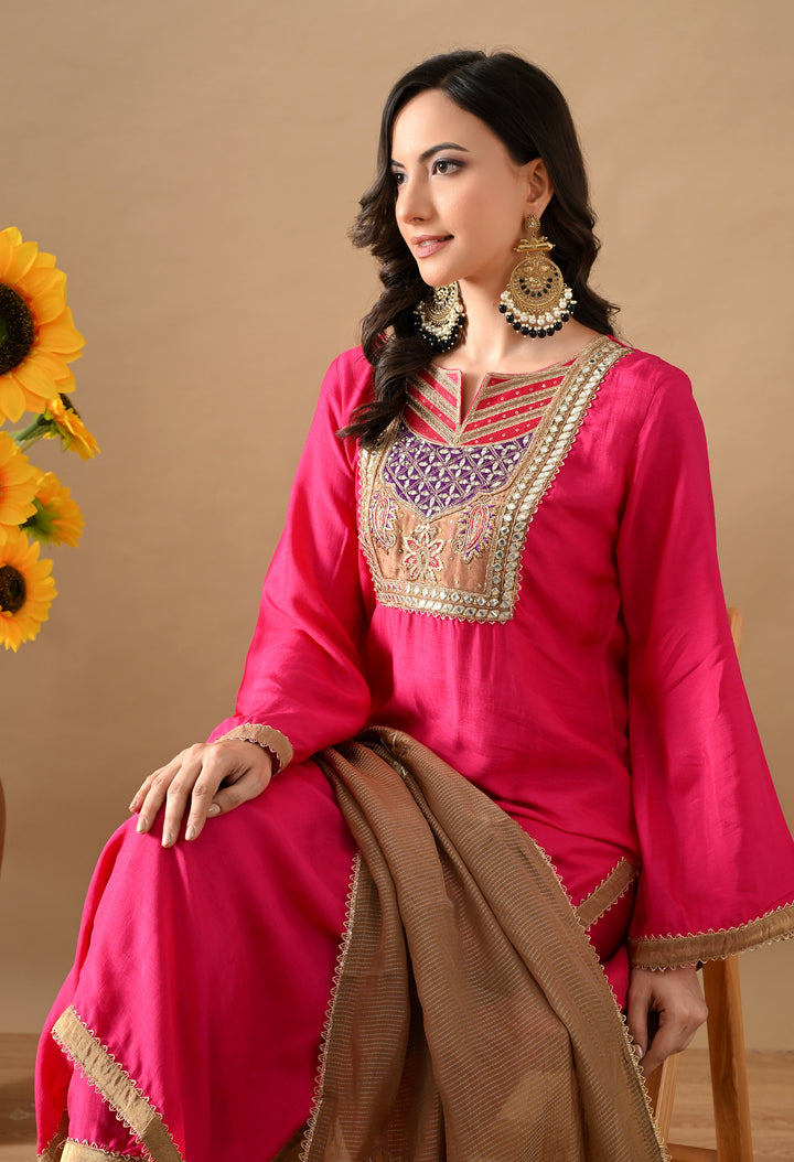 Make every occasion extra special with this Magenta Mirror Gotta Raw Silk Suit — a perfect blend of elegance and shimmer! The A-line kurta in rich raw silk features intricate gotta, mirror, shimmer, and sequin work near the neckline, along with golden lace at the ghera for a regal touch. The full bell sleeves and round neck add to its charm. Paired with stylish pants featuring side lace and a shimmer organza dupatta with 4-side gotta lace, this outfit is made to stand out. Perfect for festive events, weddings, or special evenings!