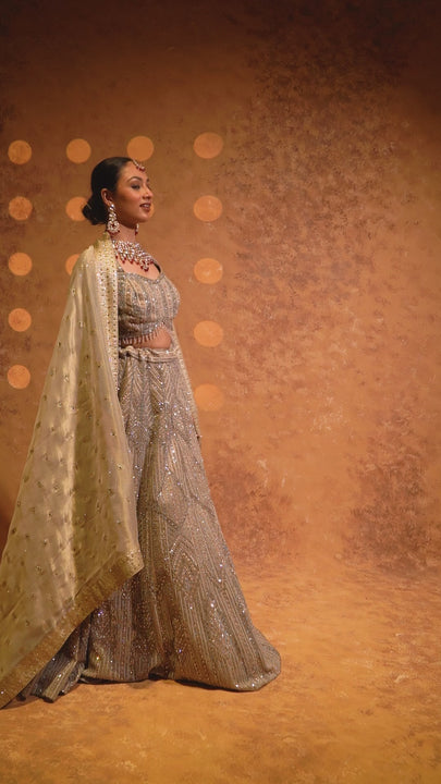 Radiate sophistication in our Moonlit Grace Grey Indo-Western Lehenga Set, a mesmerizing blend of elegance and glamour. Crafted in fine net fabric, this ensemble is adorned with dazzling sequins, mirror, and siroski handwork that beautifully catch the light with every move. The square-neck full-sleeve blouse offers a modern yet regal look, while the net dupatta with border and booti work adds a delicate finishing touch. Designed with a cotton lining and can-can, it provides both comfort and volume - making it the perfect outfit for receptions, cocktail parties, and festive evenings.