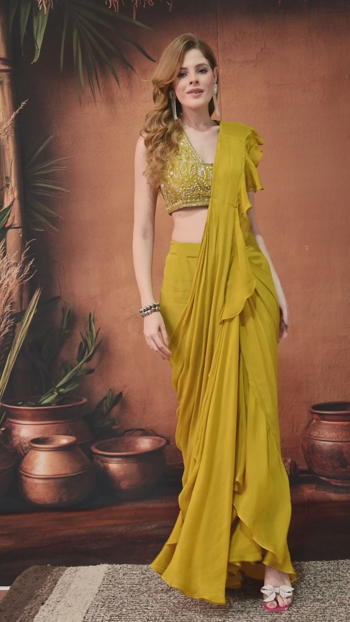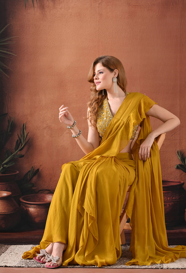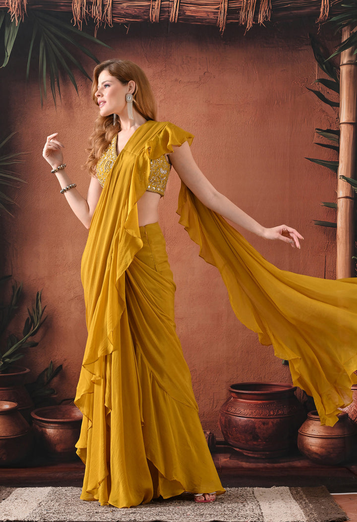 Shine in this mustard yellow skirt saree with a playful ruffle pallu and back pochuu style. Crafted in pure crepe and chinon crepe, it features a trapze neckline crop top with padded cut sleeves. Adorned with cut-dana sequins, zari thread, and pearls, it’s perfect for festive and party occasions.