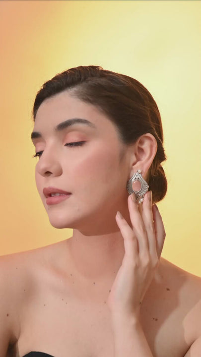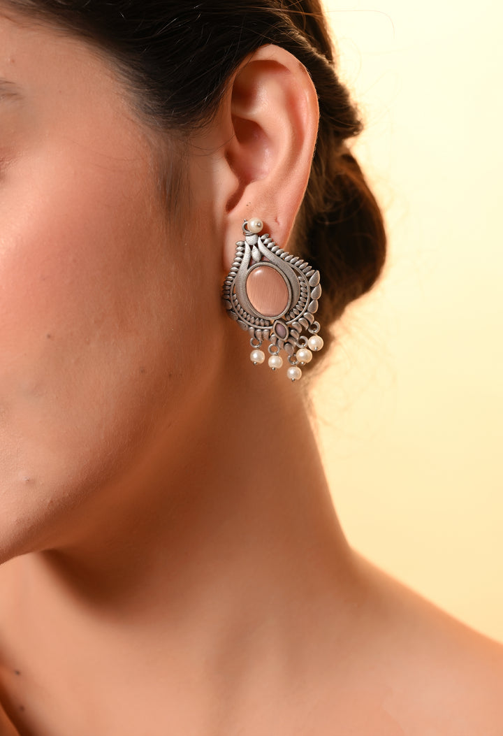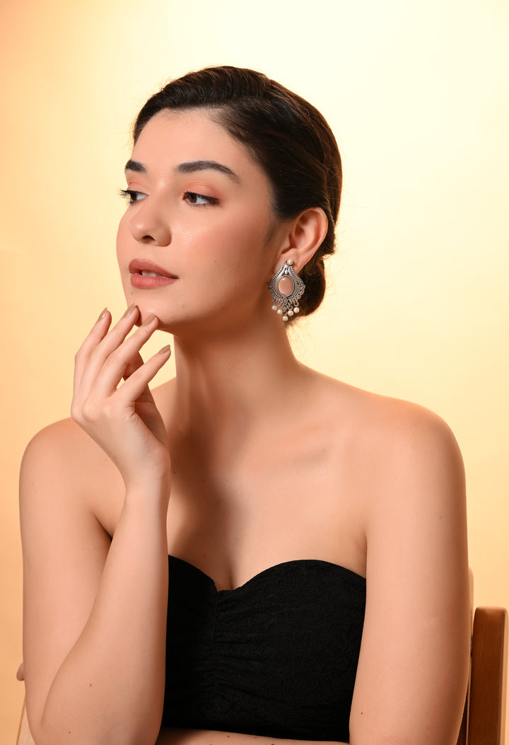 Elevate your everyday elegance with the Mystic Pearl Drop Oxidized Earrings. Crafted in a teardrop silhouette with intricate oxidized detailing, these earrings feature a soft blush centerpiece adorned with delicate pearl danglers. The perfect fusion of tradition and sophistication, they add a refined charm to both ethnic and modern ensembles, making them a must-have for every jewelry lover.