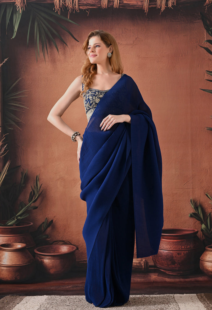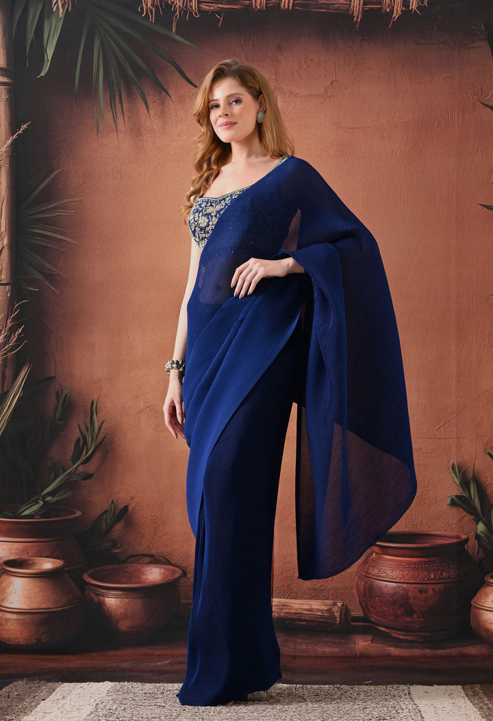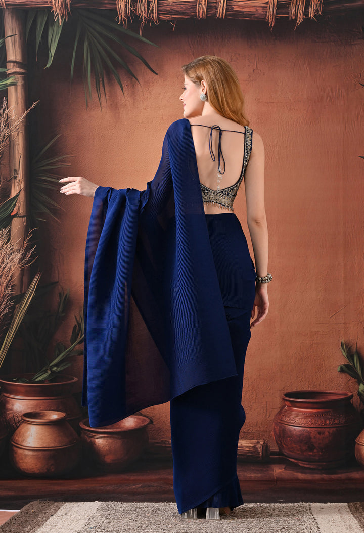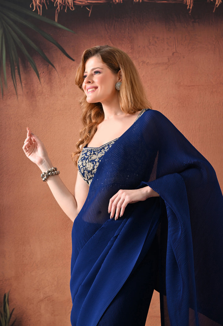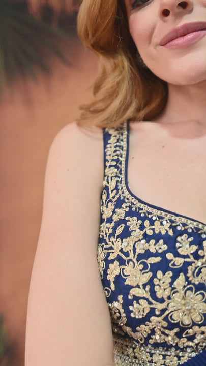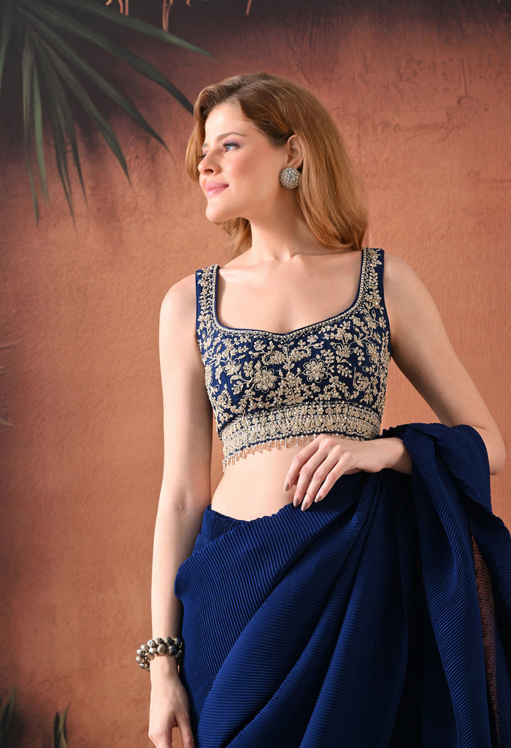 Elegant navy blue rapron drape saree crafted from imported fabric, featuring dazzling zari, sequin, mirror, and cut-dana work. Sweetheart neckline with deep back and dori, paired with stylish cut sleeves – perfect for festive and party occasions.