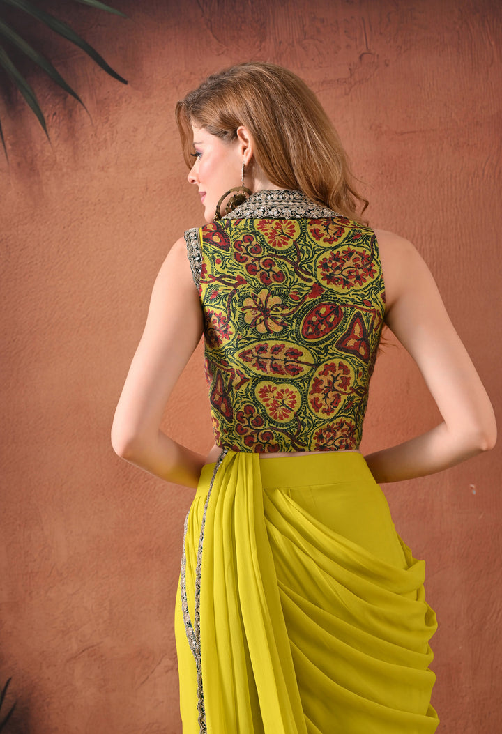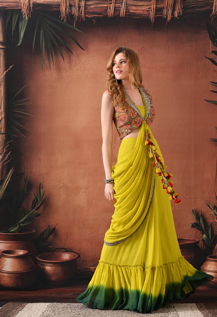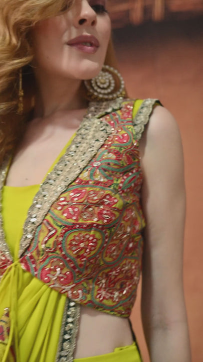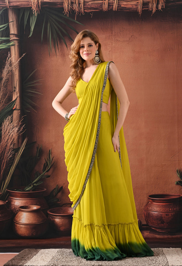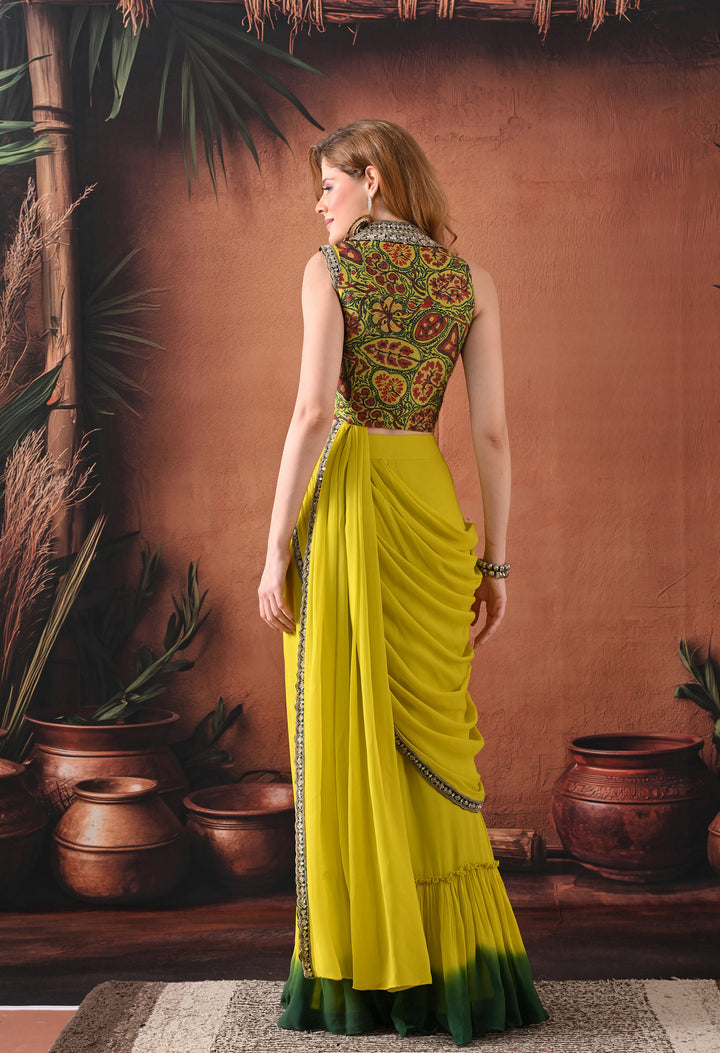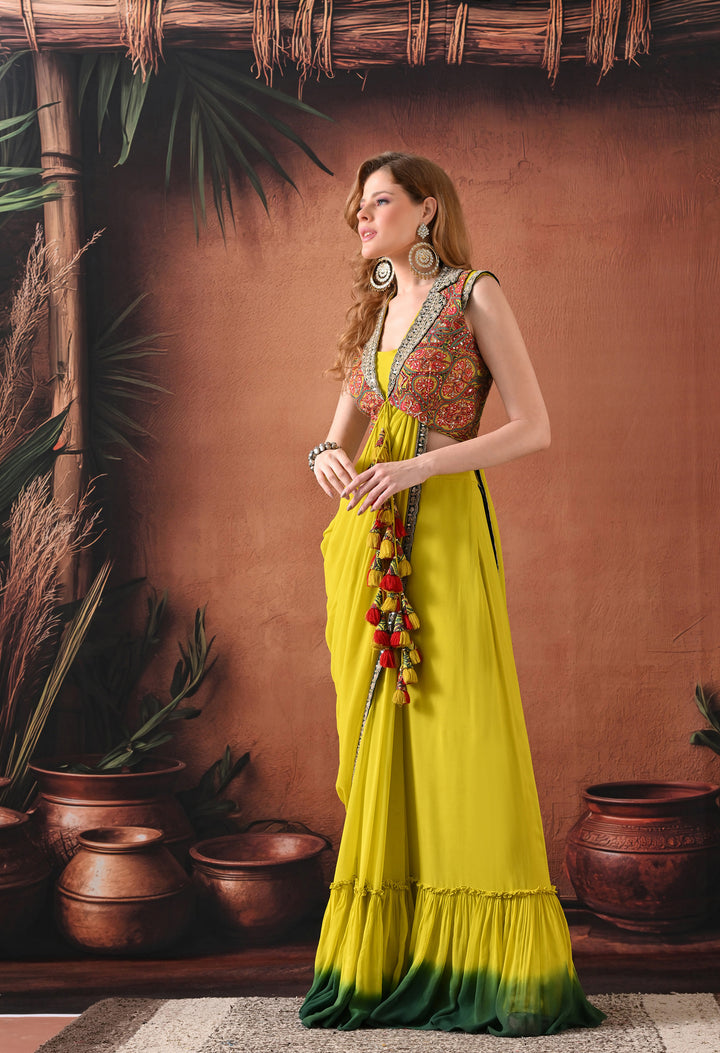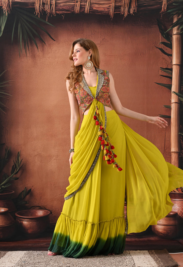 Turn heads with this stunning Indo-Western drape set! Featuring a double-shade yellow & neon green skirt with elegant ghere work, a spaghetti crop top with a round neck, and a short jacket adorned with Japuri print, zari, mirror, and sequins. Lightweight georgette fabric with cut sleeves and gathered borders makes it perfect for parties and festive vibes.