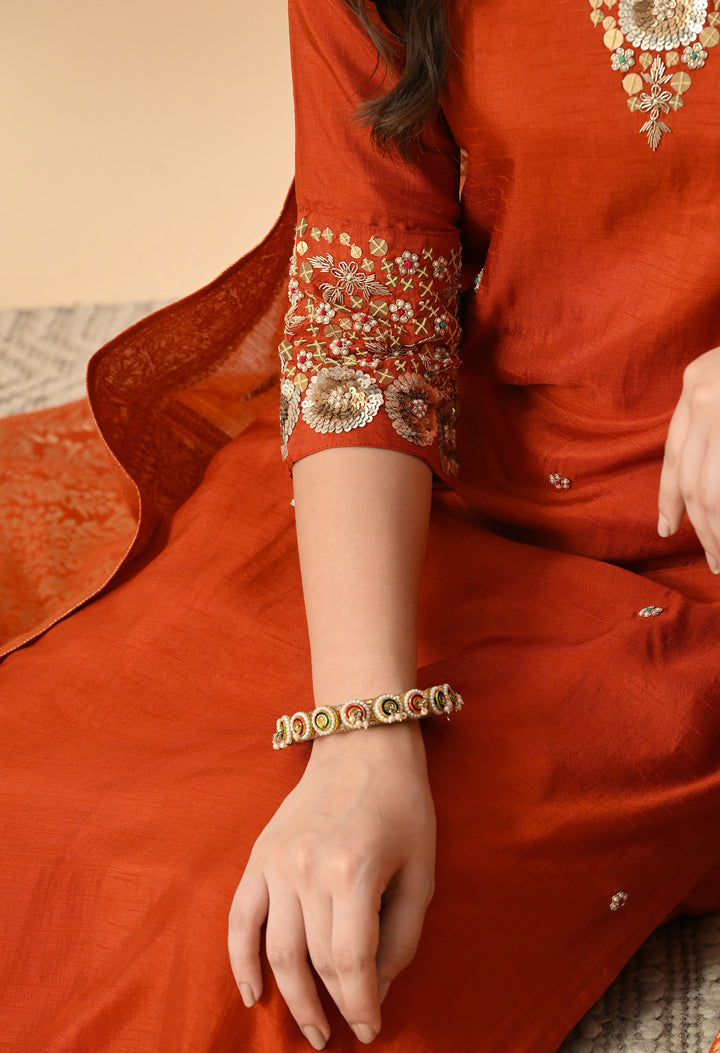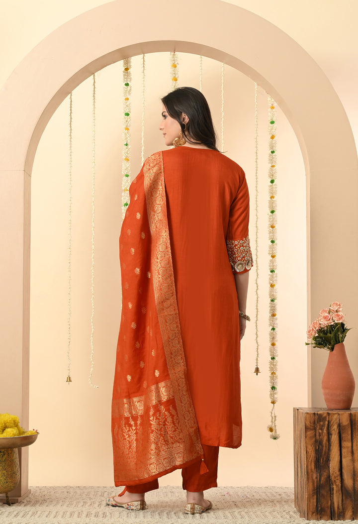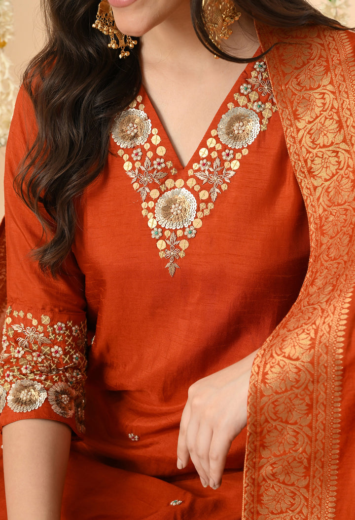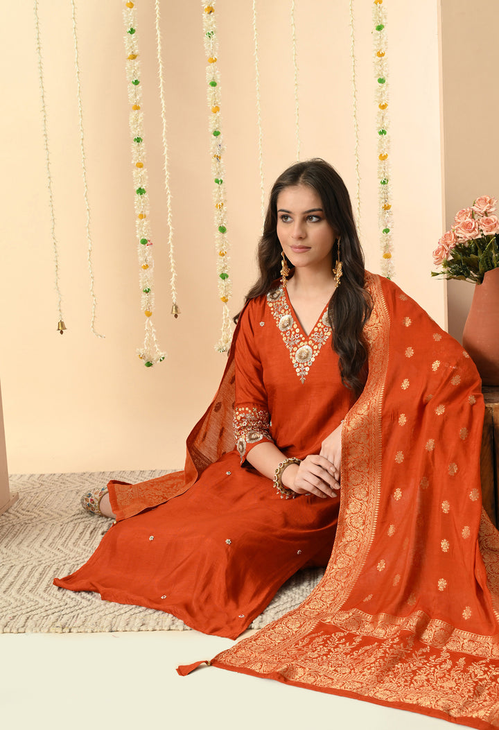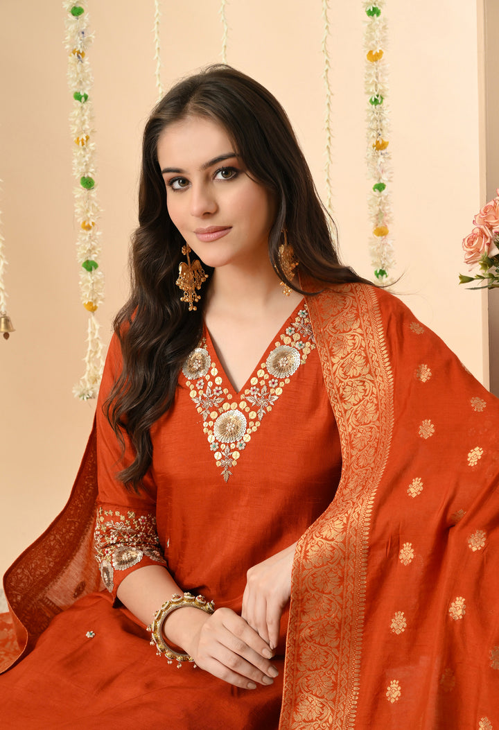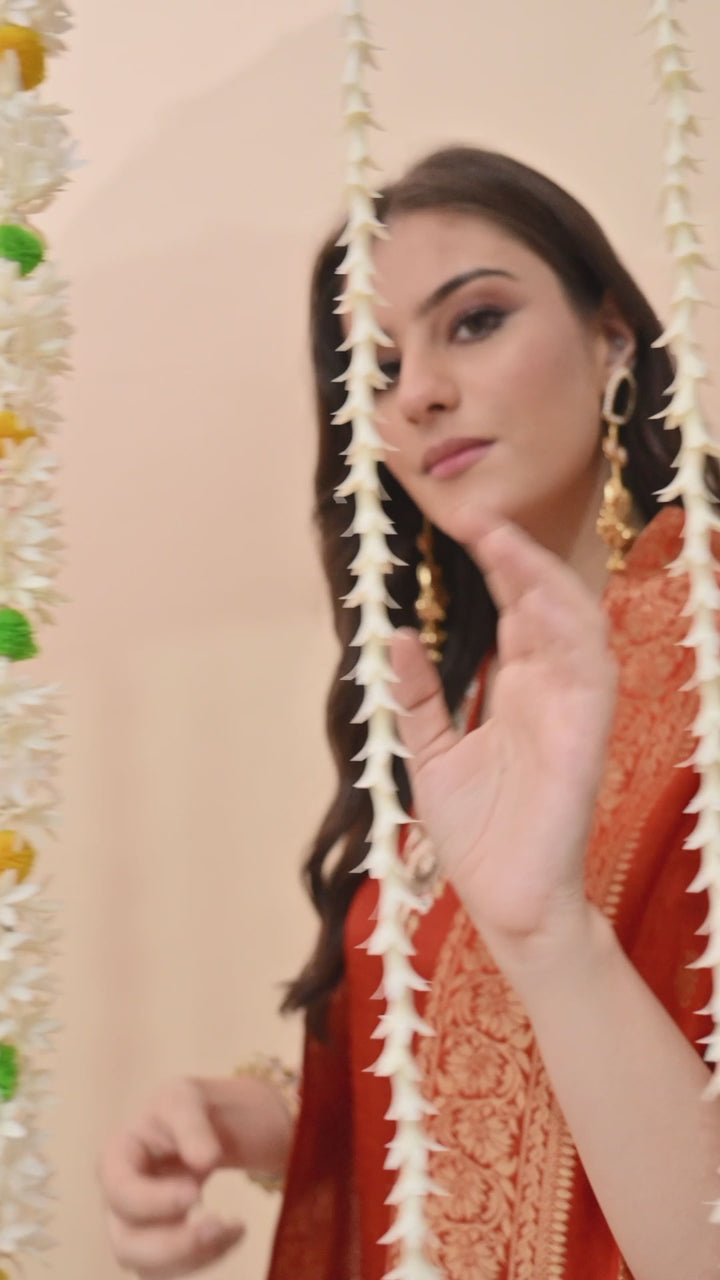 Make every occasion special with this stunning orange partywear suit. The long kurti in chanderi silk is beautifully decorated with dabka, sequins, pearl, and delicate thread work, giving you a rich and festive look. The V-neck and 3/4 sleeves add elegance, while the side-zip pant makes it comfortable and stylish. The brocket silk dupatta with four-side tassels completes the outfit, making it perfect for weddings, parties, and festive celebrations. With soft lining, this suit feels as good as it looks. A must-have outfit to shine effortlessly at every event!