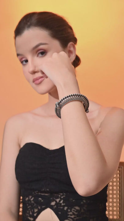 Add a regal charm to your look with the Oxidized Mesh Beaded Kada, a masterpiece of traditional artistry and bold design. This handcrafted piece features a unique mesh pattern bordered by antique silver beads, giving it a rustic yet sophisticated finish. Its vintage-inspired look makes it a perfect match for ethnic, boho, and Indo-fusion outfits. Whether you’re dressing for a festive celebration or an elegant evening, this kada will elevate your ensemble with timeless allure.