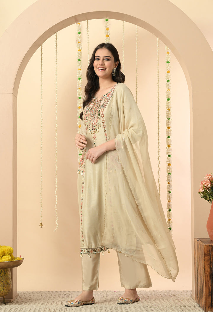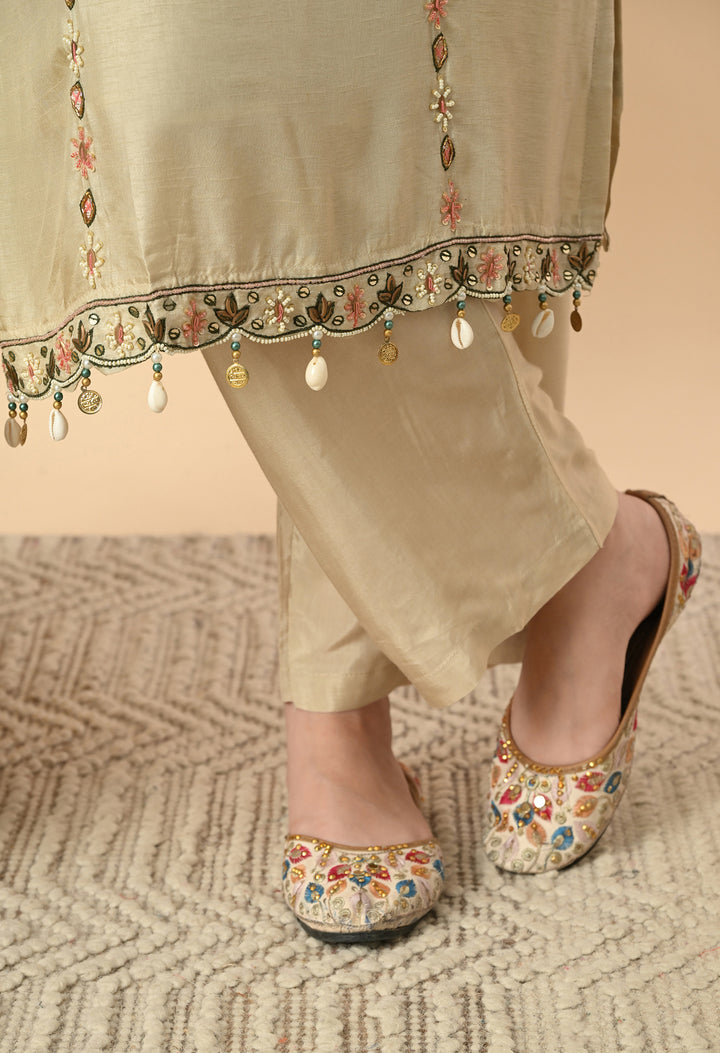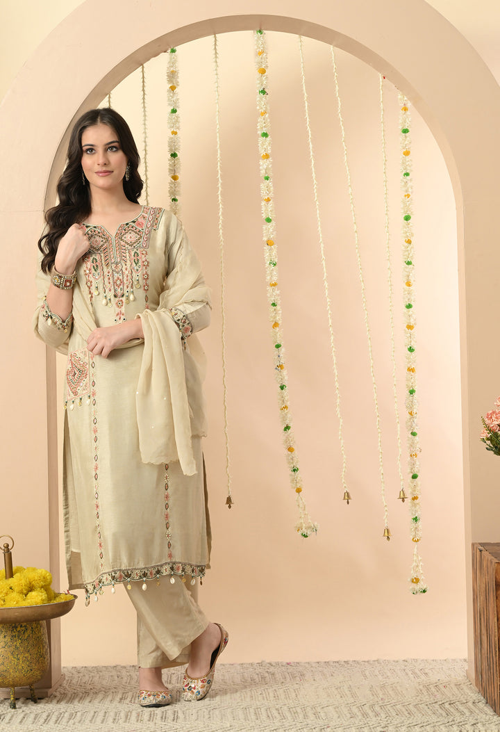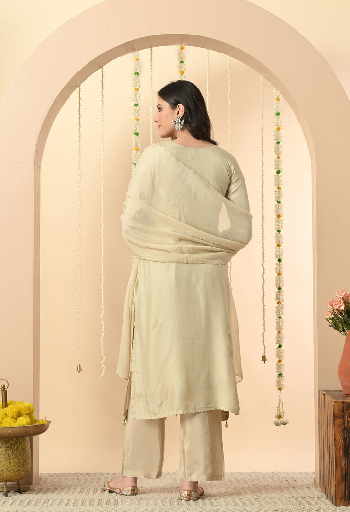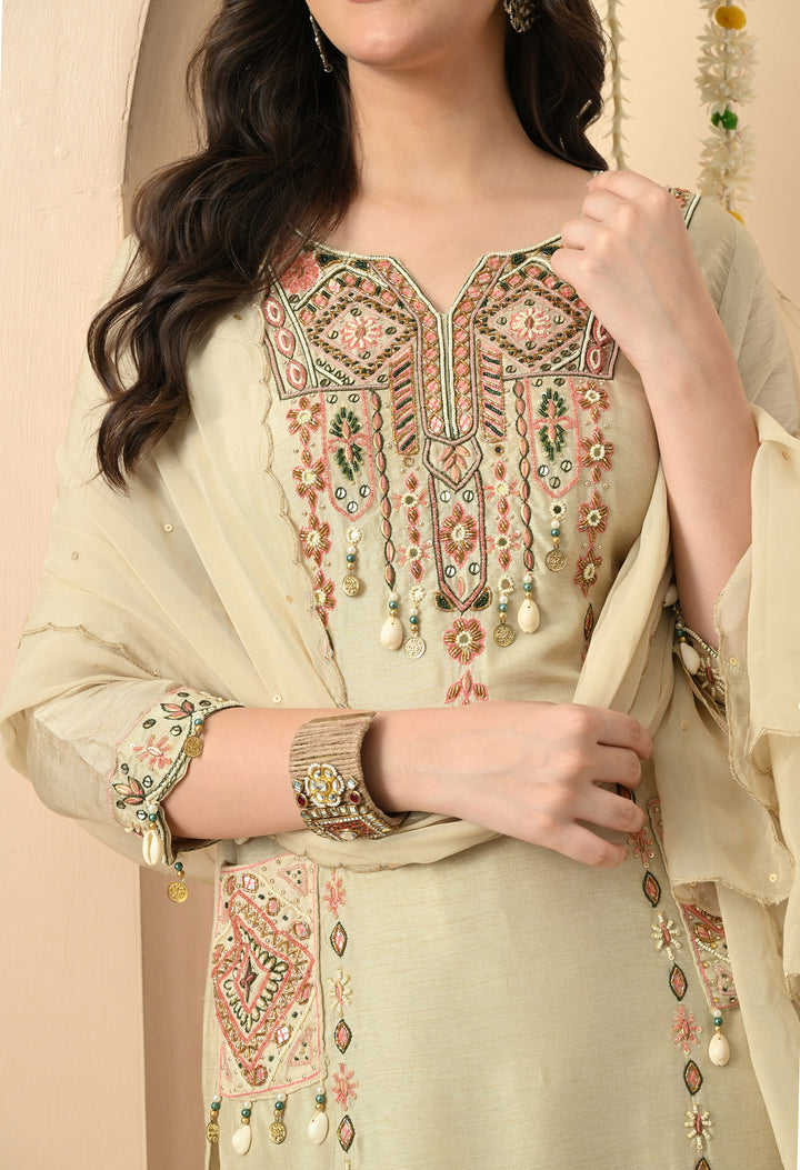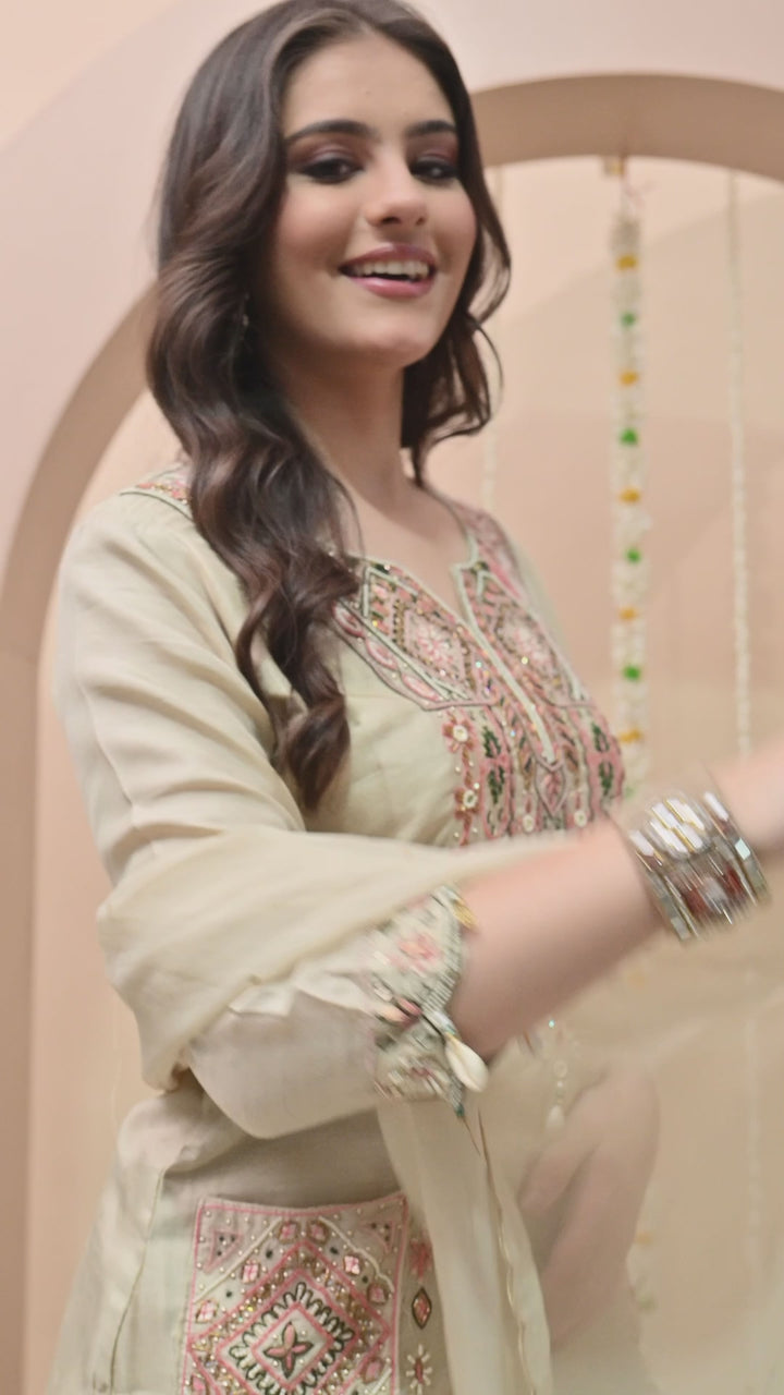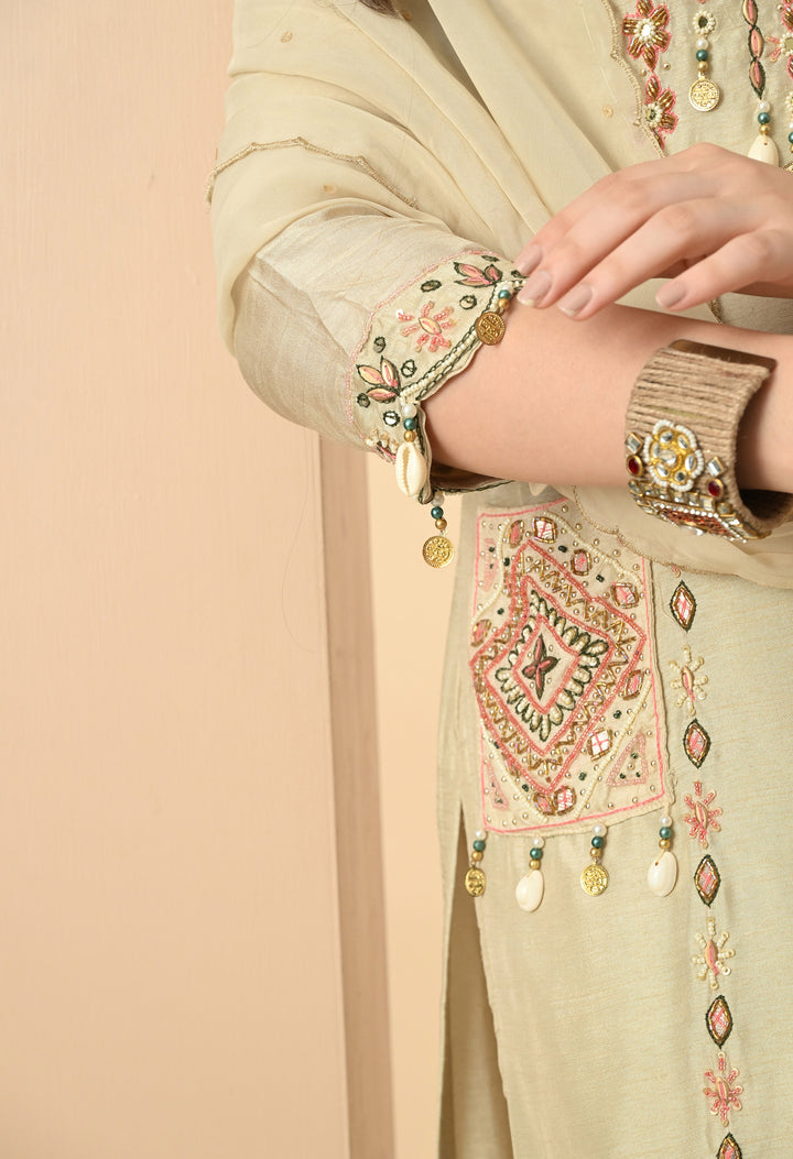 Turn heads at every occasion with this pastel light green partywear suit. The silk kurti, designed with a round neck and V-cut, features delicate work of kodi, thread, pearls, sippy, and cut dana, giving it a rich yet graceful look. The 3/4 sleeves and side pocket add both style and convenience. Paired with sleek pants, the outfit ensures comfort and elegance. The organza crepe dupatta, detailed with sequins and four-side scalloping, completes this charming ensemble. With full lining, the outfit feels as comfortable as it looks stunning. Perfect for festive parties and celebrations.