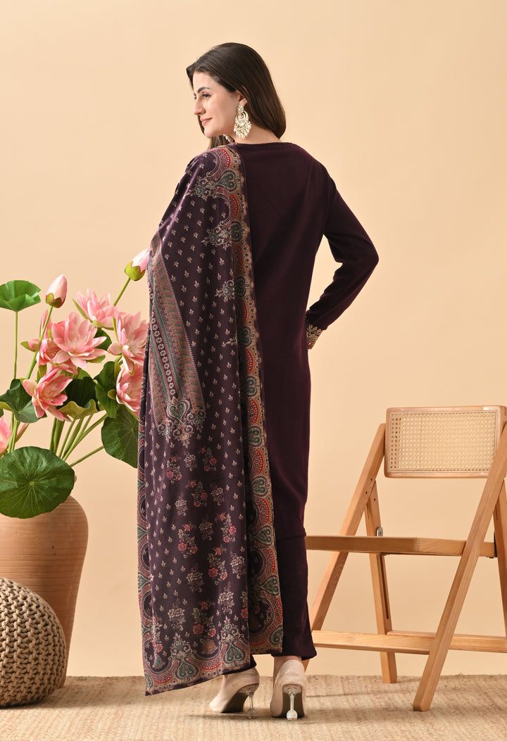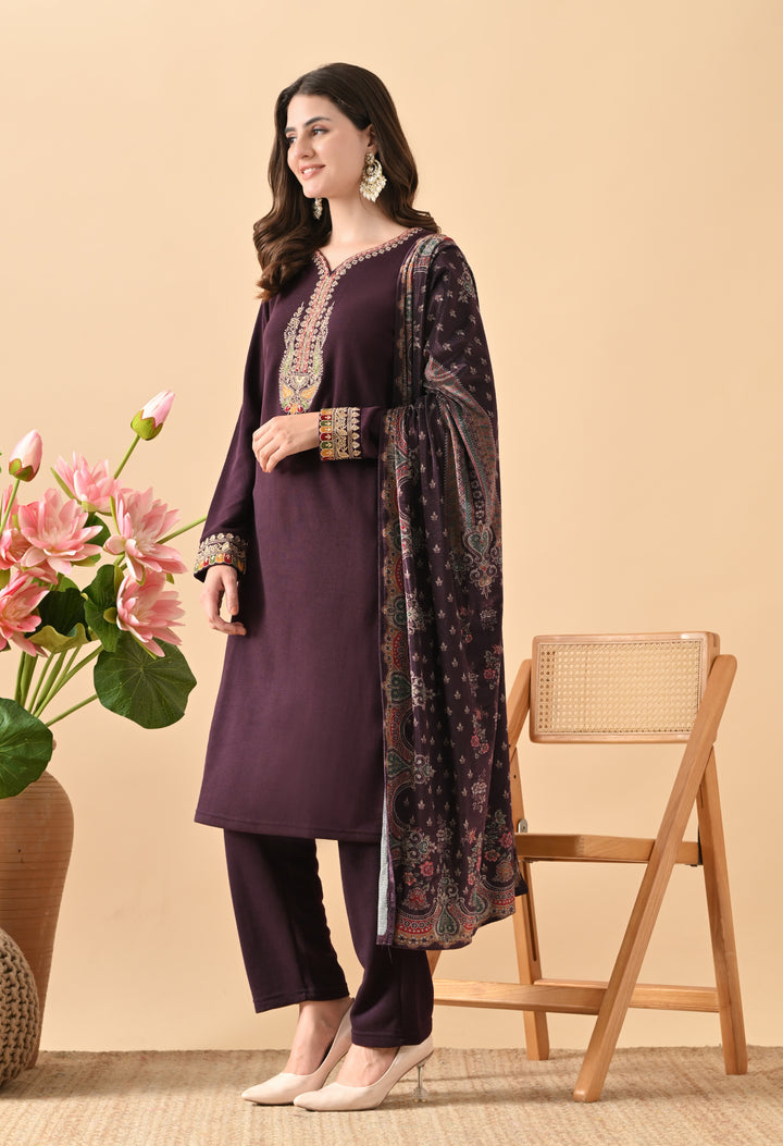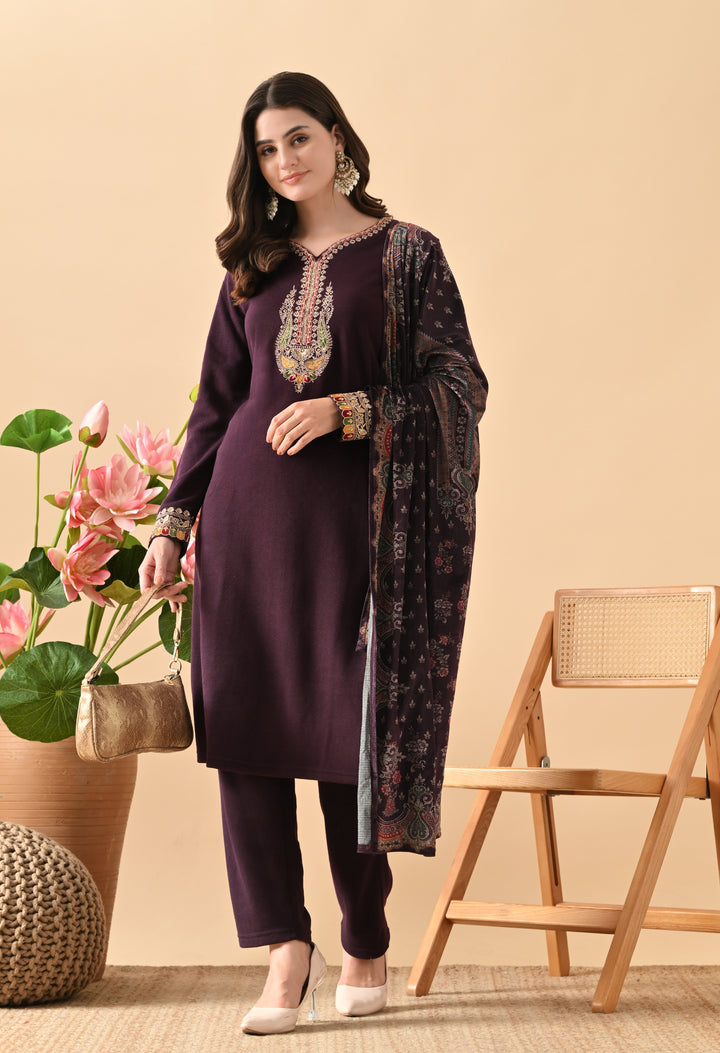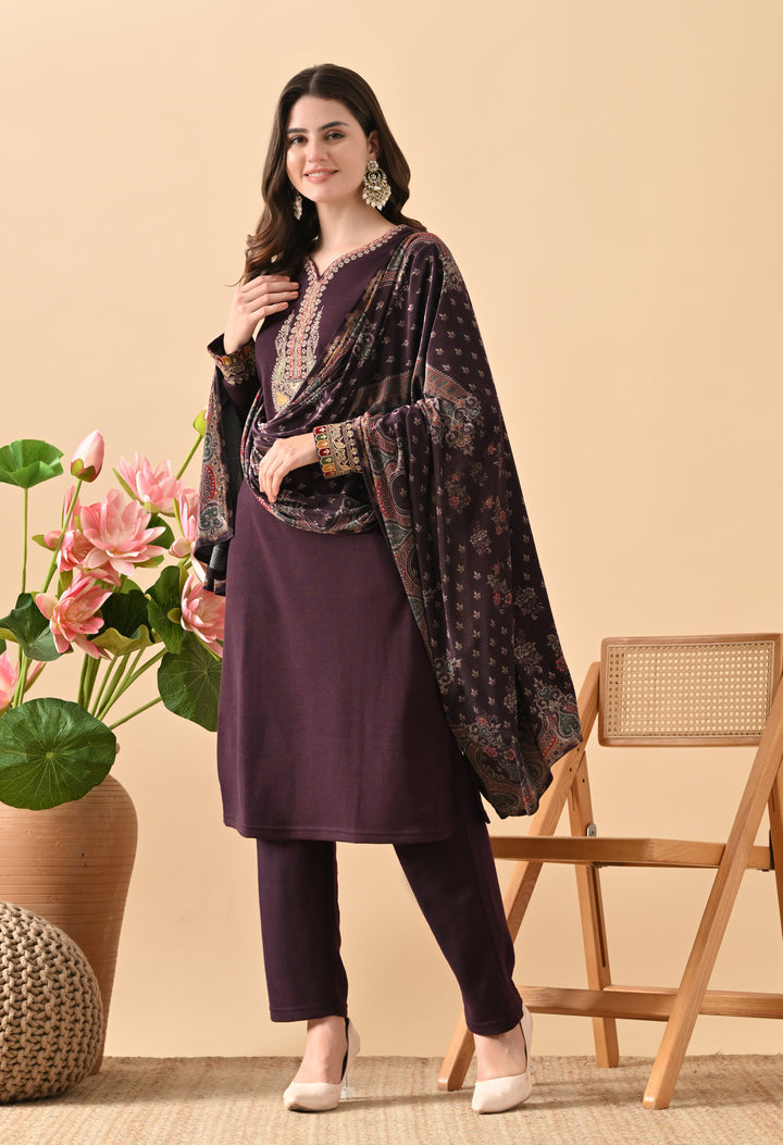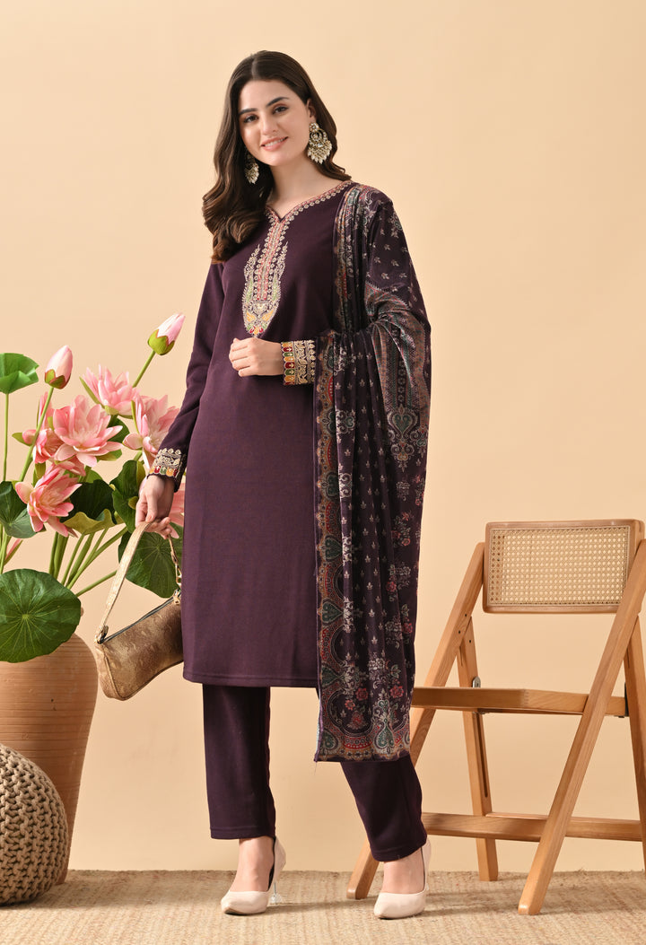 Discover the beautiful elegance of our "Radiant Dark Purple Woollen Suit." Made from soft wool, this stylish outfit features stunning zari and thread work that sparkles in the light. The full-sleeve design offers warmth, while the unique paan-shaped neck adds a touch of sophistication. Complete with comfortable pants featuring two side pockets and a gorgeous mithela print dupatta, this suit is perfect for any occasion. Whether you're dressing up for a celebration or just want to feel fabulous, this outfit will make you the star of the show. Don't miss out—add it to your wardrobe today!