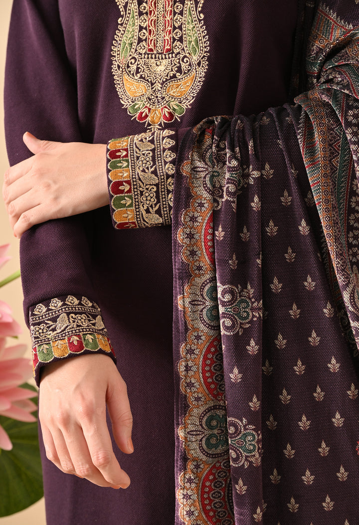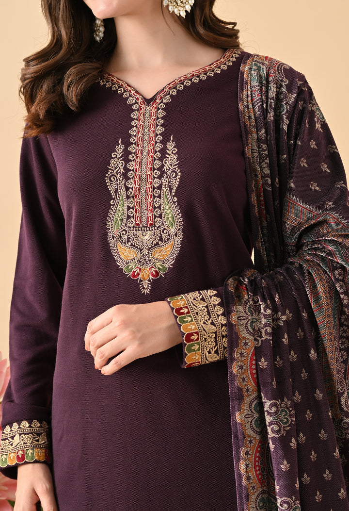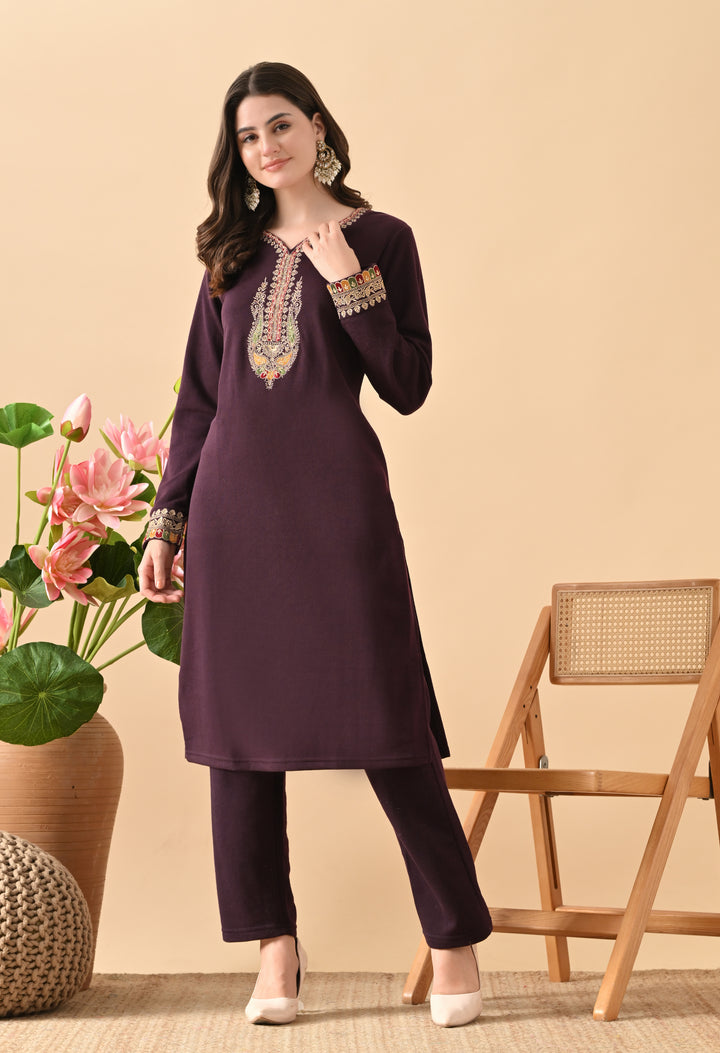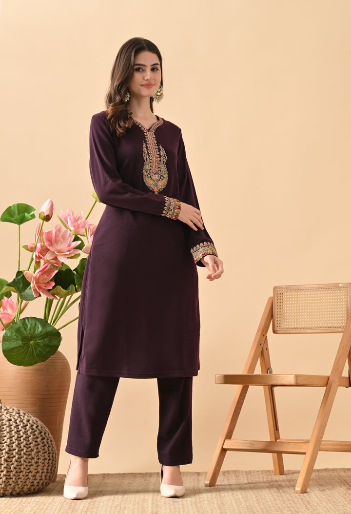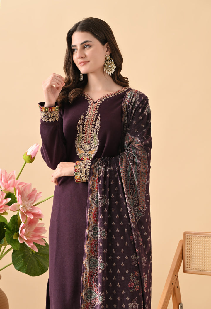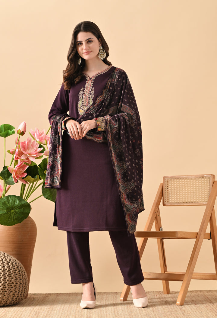 Discover the beautiful elegance of our "Radiant Dark Purple Woollen Suit." Made from soft wool, this stylish outfit features stunning zari and thread work that sparkles in the light. The full-sleeve design offers warmth, while the unique paan-shaped neck adds a touch of sophistication. Complete with comfortable pants featuring two side pockets and a gorgeous mithela print dupatta, this suit is perfect for any occasion. Whether you're dressing up for a celebration or just want to feel fabulous, this outfit will make you the star of the show. Don't miss out—add it to your wardrobe today!