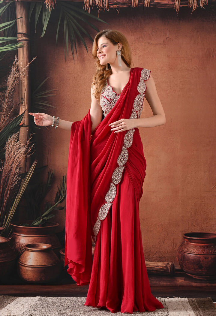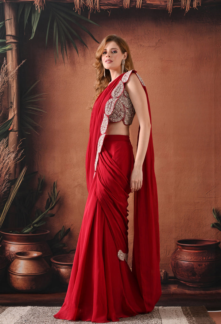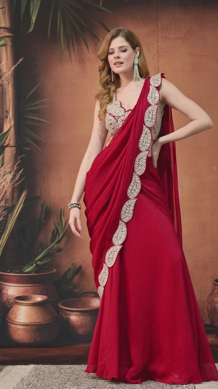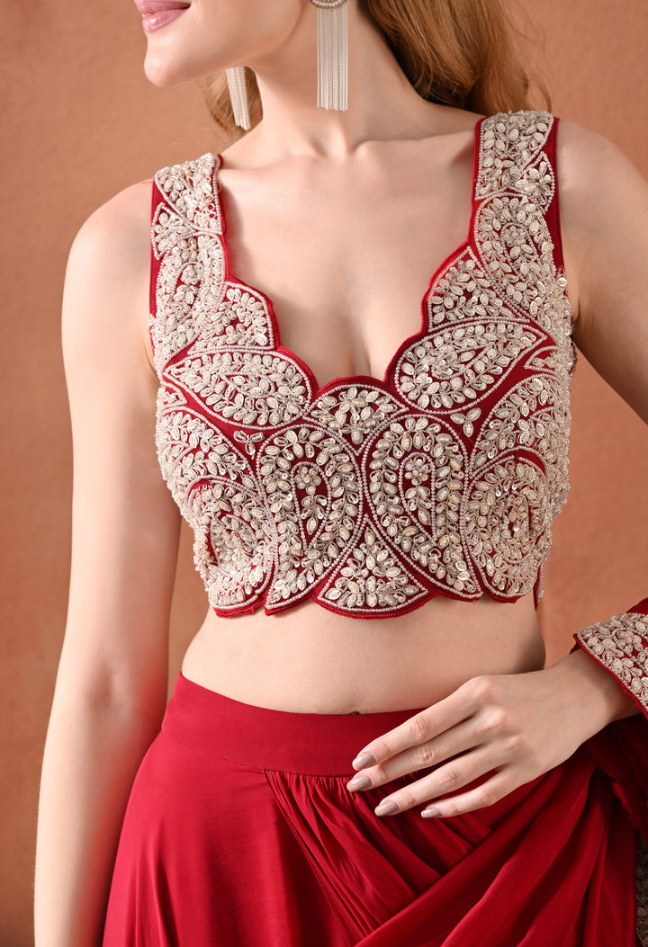 Turn heads in this stunning red organza crepe saree, featuring a draped skirt-style look. The pallu is adorned with delicate pearl and sequin leaf work along the border. It comes with a trapeze neckline, deep back, and chic cut sleeves with dori detailing – perfect for festive and party occasions.