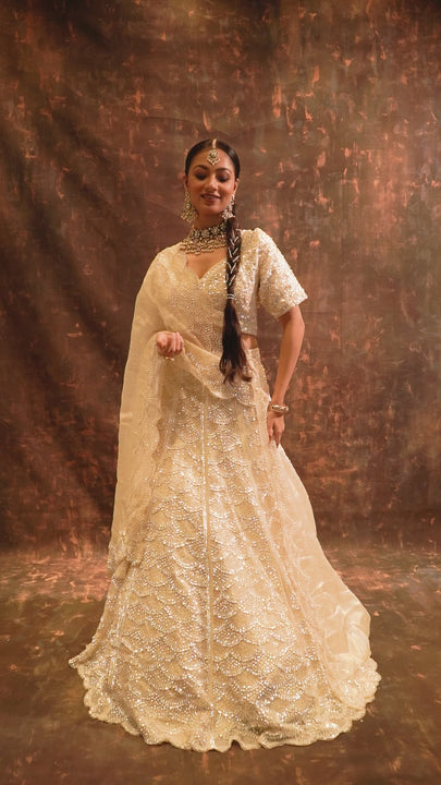 Shine on your special day with this off-white bridal lehenga in luxurious organza. Embellished with intricate floral embroidery and sparkling sequins, it features a heart-shaped neckline, elegant 3/4 sleeves, and a scalloped dupatta for a regal finish. Lined with santoon and cancan fabric, it’s designed to give you comfort while making a grand statement at your engagement or wedding celebration.