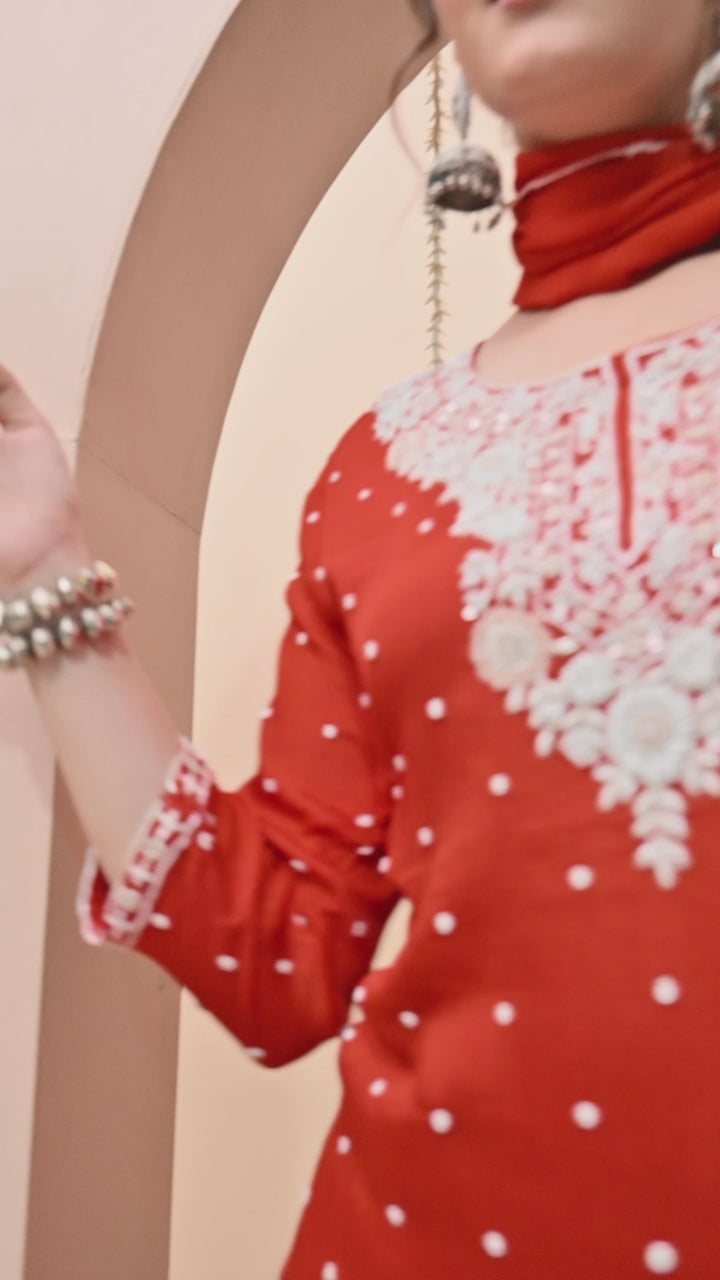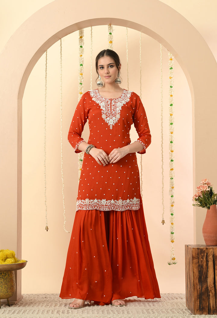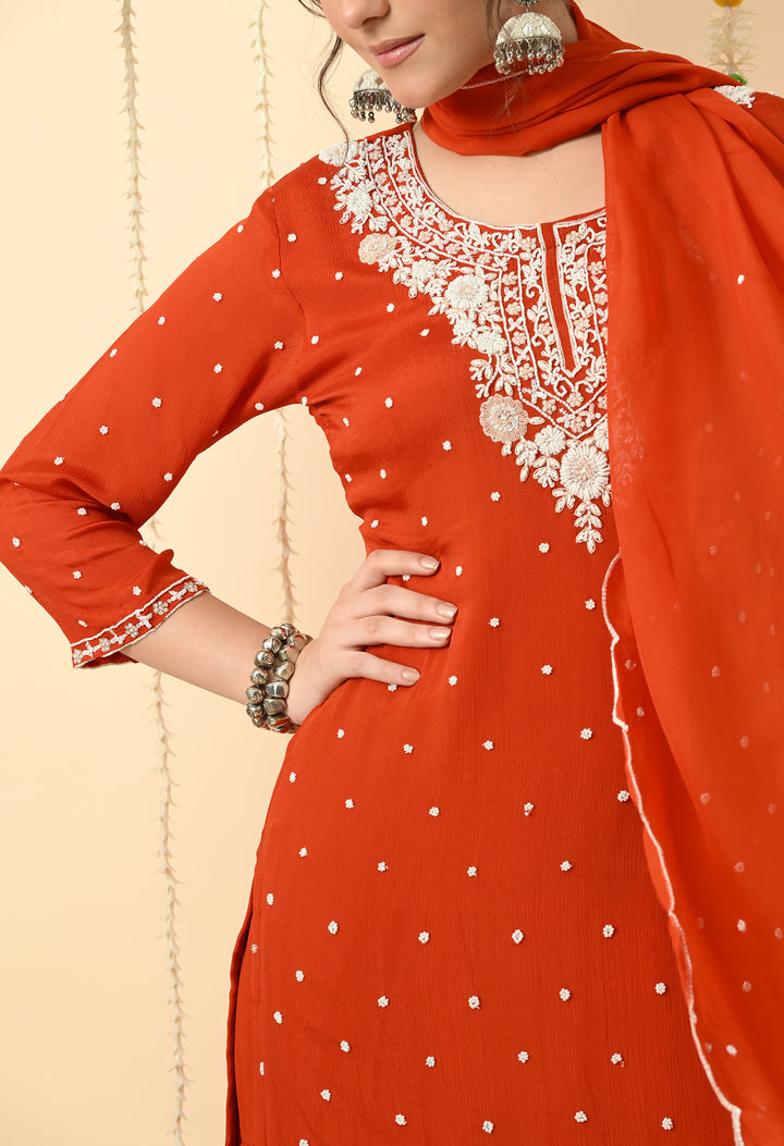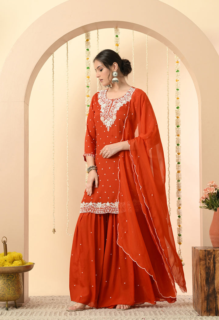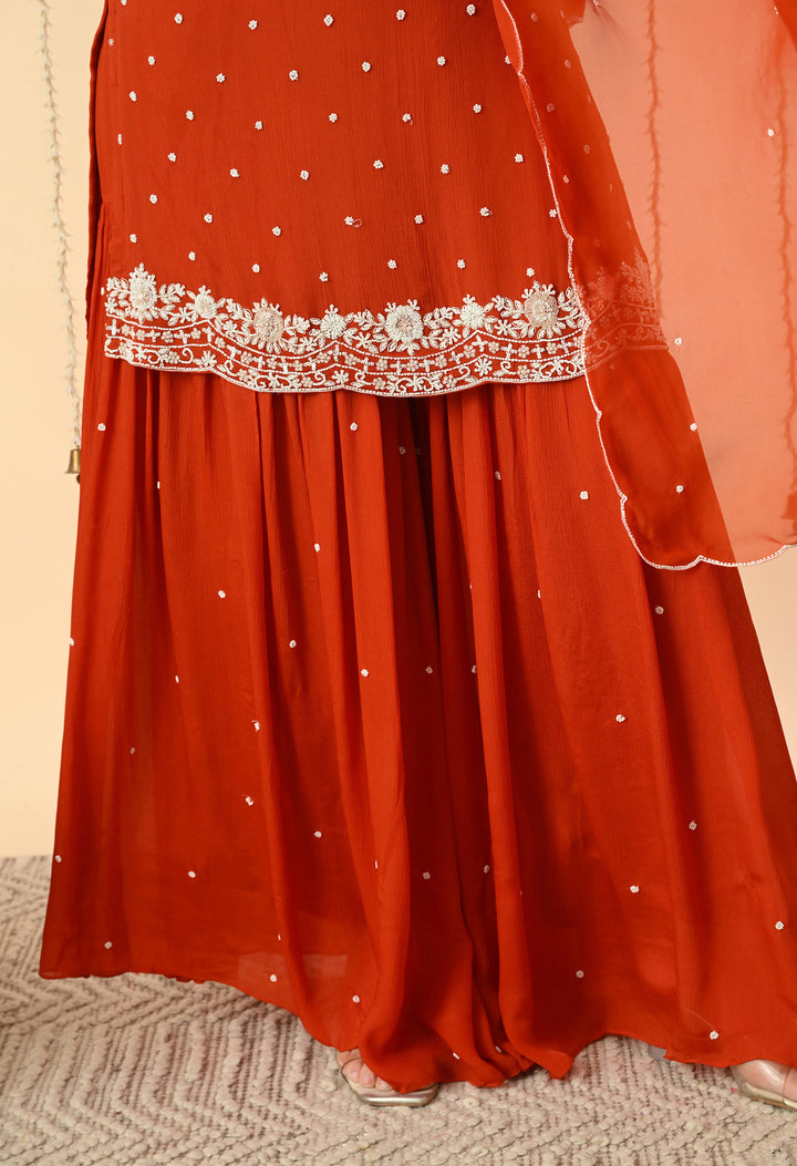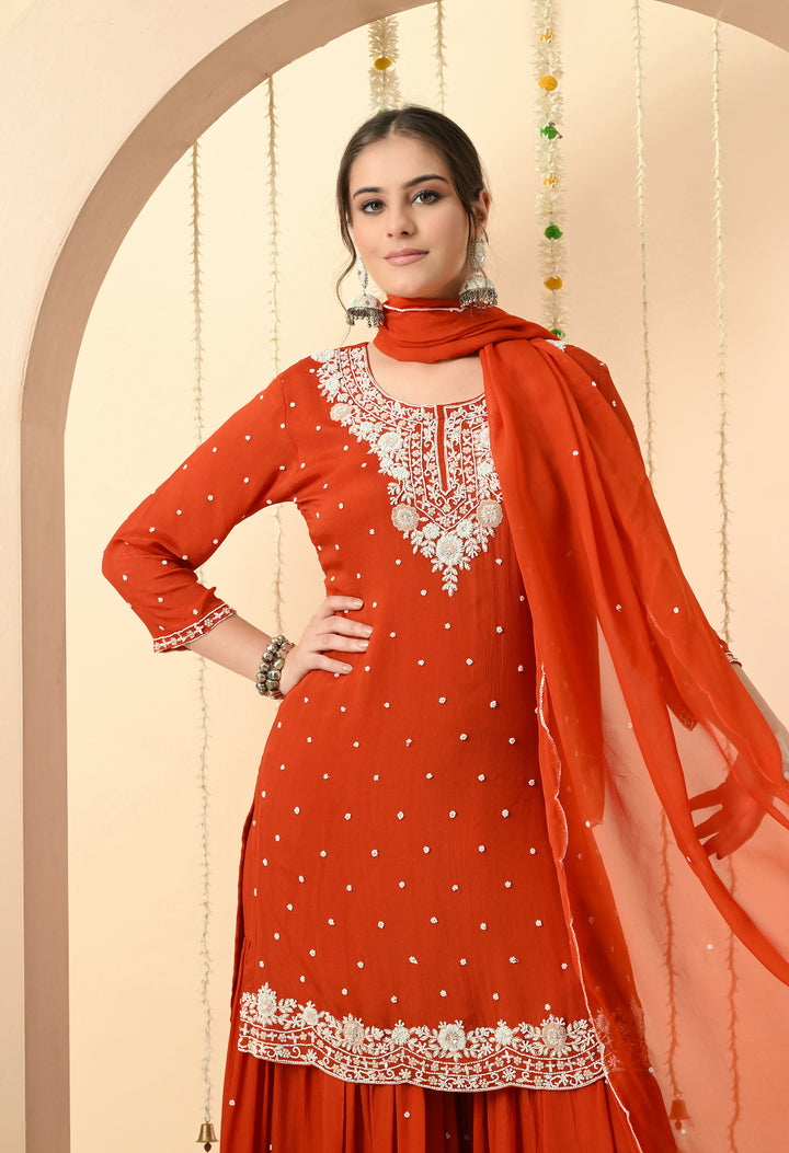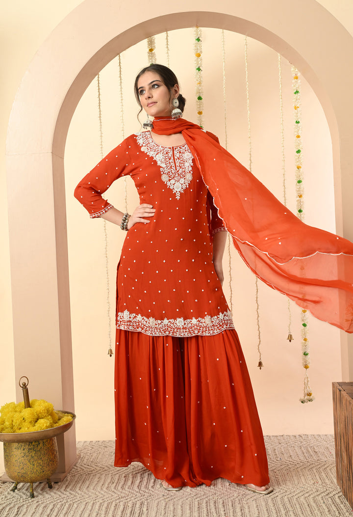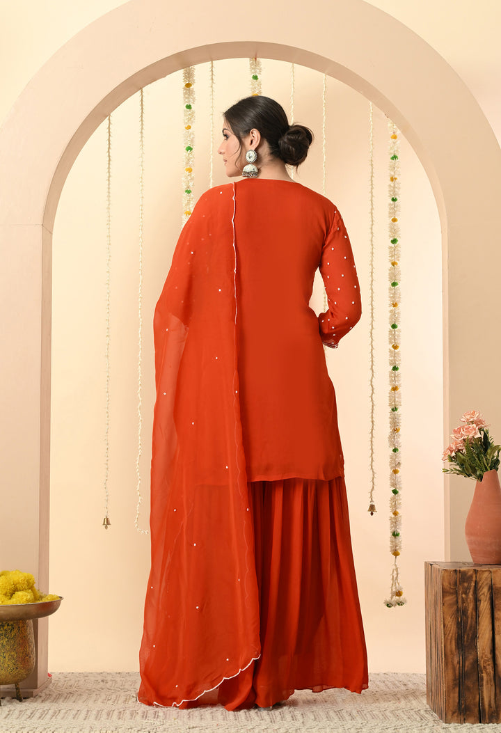 Step into elegance with the Sparkling Orange Pearl Garara Set. This partywear outfit is crafted in soft chinon crepe fabric, offering both comfort and style. The short kurti features delicate pearl work, shimmering sequins, and detailed cut dana that catch the light beautifully. The matching garara adds flair and flow to your look, while the 3/4 sleeves and round neck design bring a graceful touch. Completing the set is a stunning organza crepe dupatta with 4-side scalloping and fine cut dana work. Perfect for weddings, parties, and festive occasions, this outfit will make you shine effortlessly.