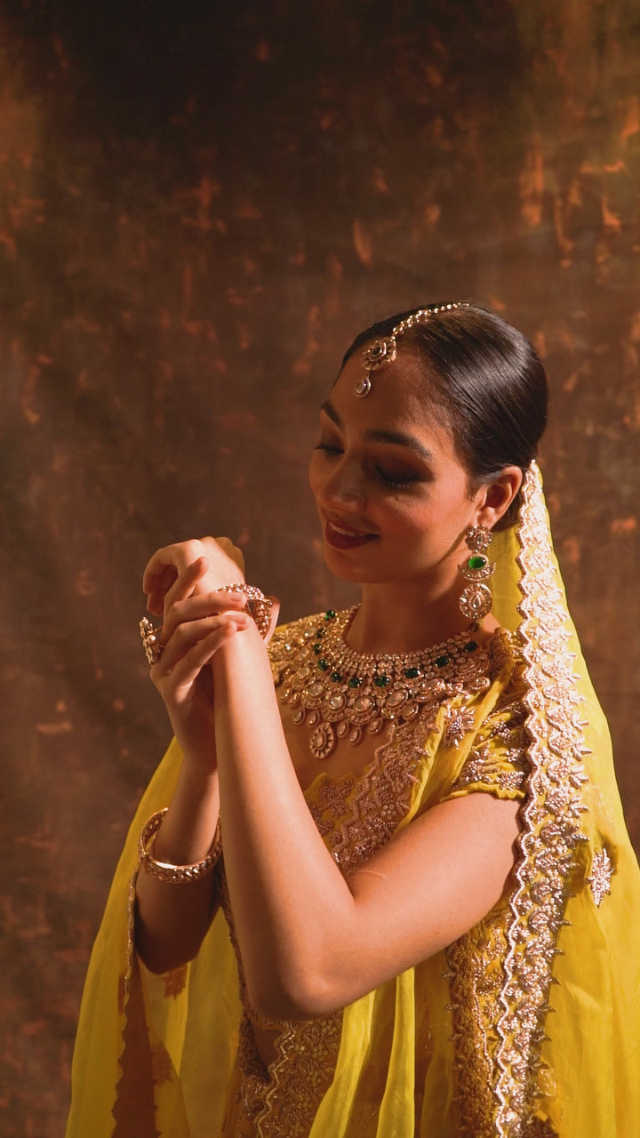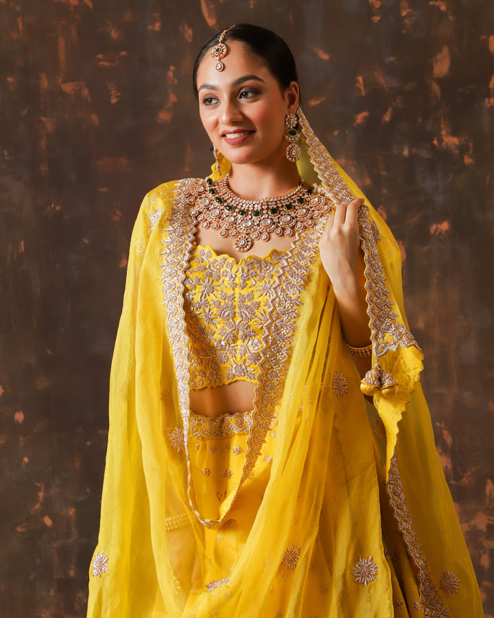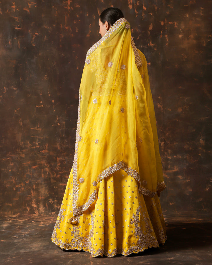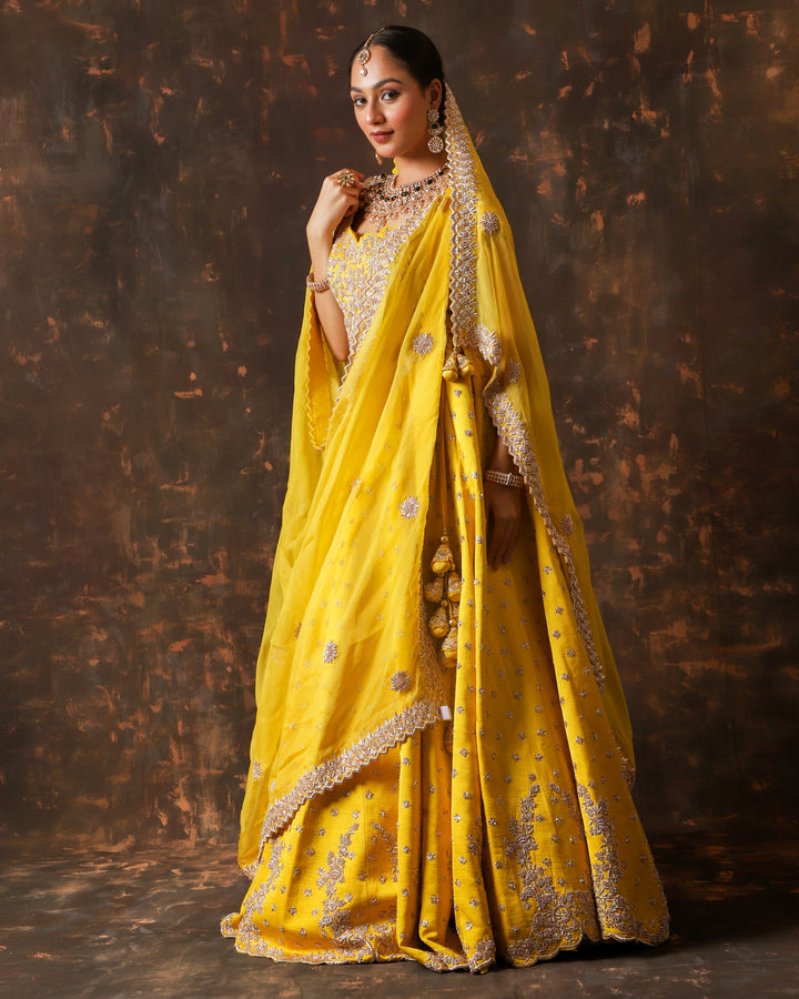 Radiate joy and elegance in our Sunlit Grace Bridal Lehenga, designed especially for haldi and pre-wedding festivities. Made from rich raw silk in a vibrant haldi yellow hue, this lehenga features exquisite dabka and zardozi hand embroidery that glimmers beautifully in natural light. The flutter-sleeve blouse with a scalloped V-neck adds a delicate feminine touch, while the organza dupatta, adorned with hand-embroidered borders and dainty booti work, completes this radiant ensemble - perfect for the bride who shines with grace and charm.