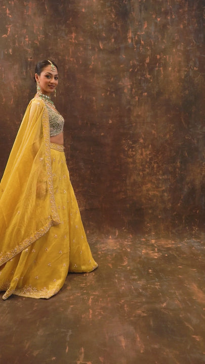 Shine bright on your Haldi day with this lime yellow bridal lehenga crafted in luxurious shimmer tissue. Adorned with intricate heavy zardosi and tikki embroidery, it features a broad V-neck, stylish cut sleeves, and a double-layered satin-organza lining with Can-can flair. The matching dupatta dazzles with scalloped edges, rich zardosi work, and hand-embroidered tassels, making every moment picture-perfect. Elegant, vibrant, and designed to celebrate you!