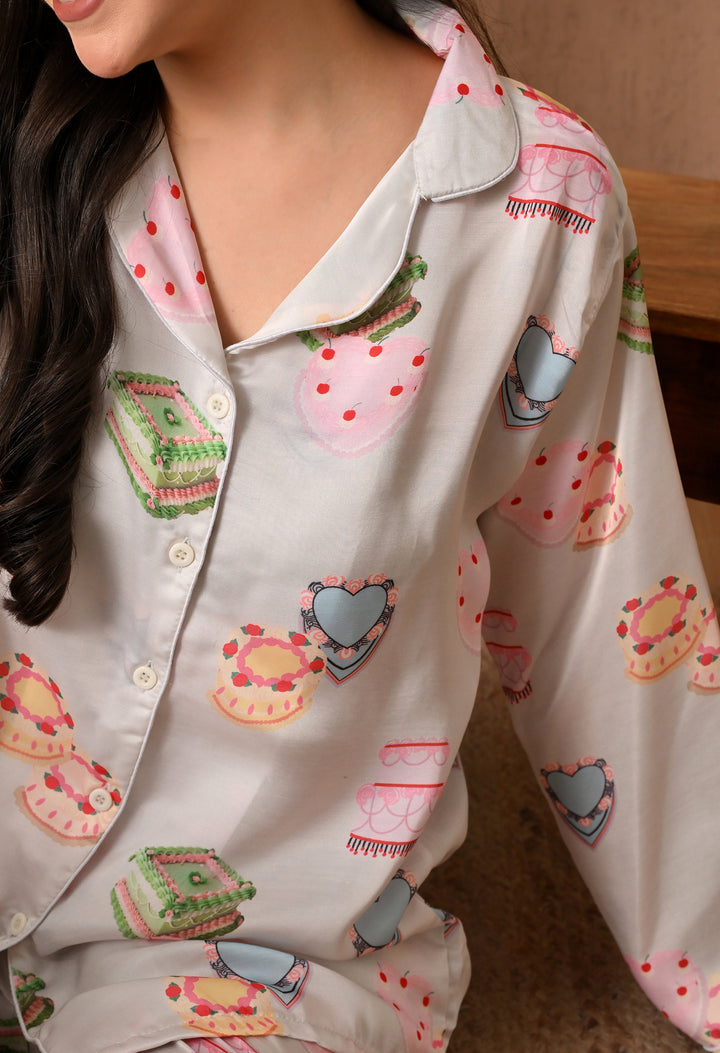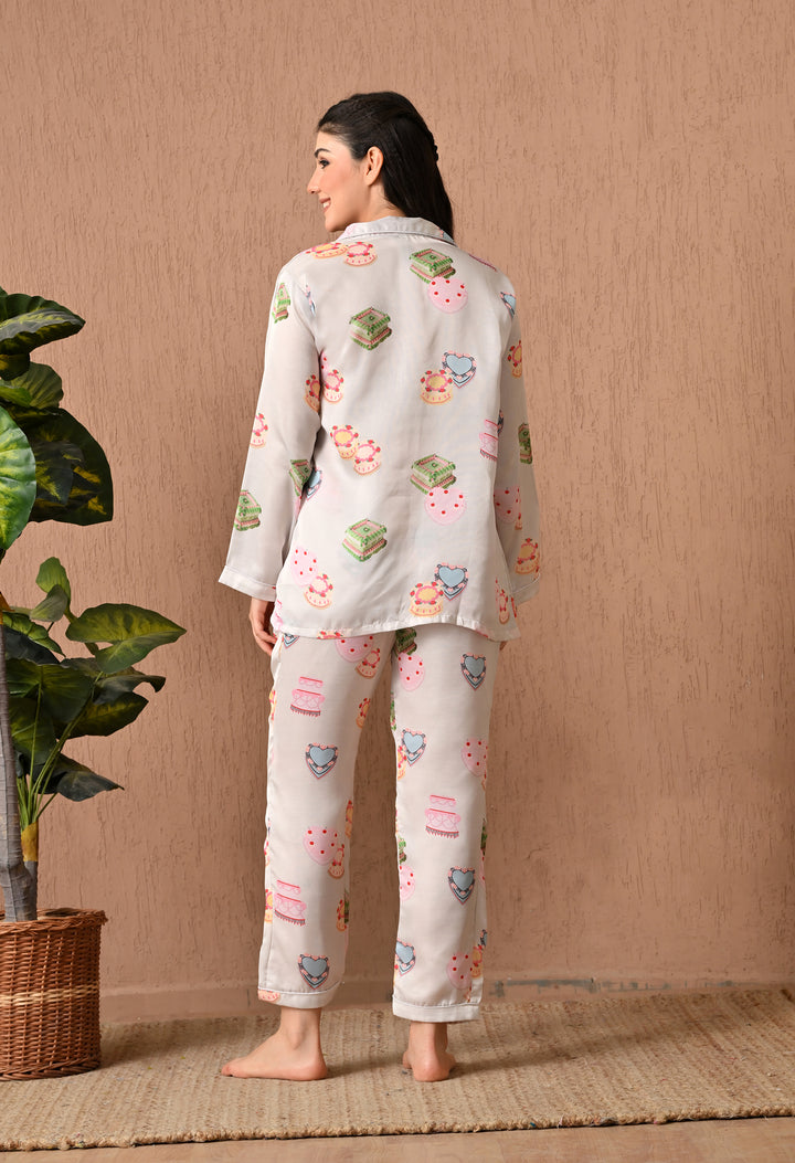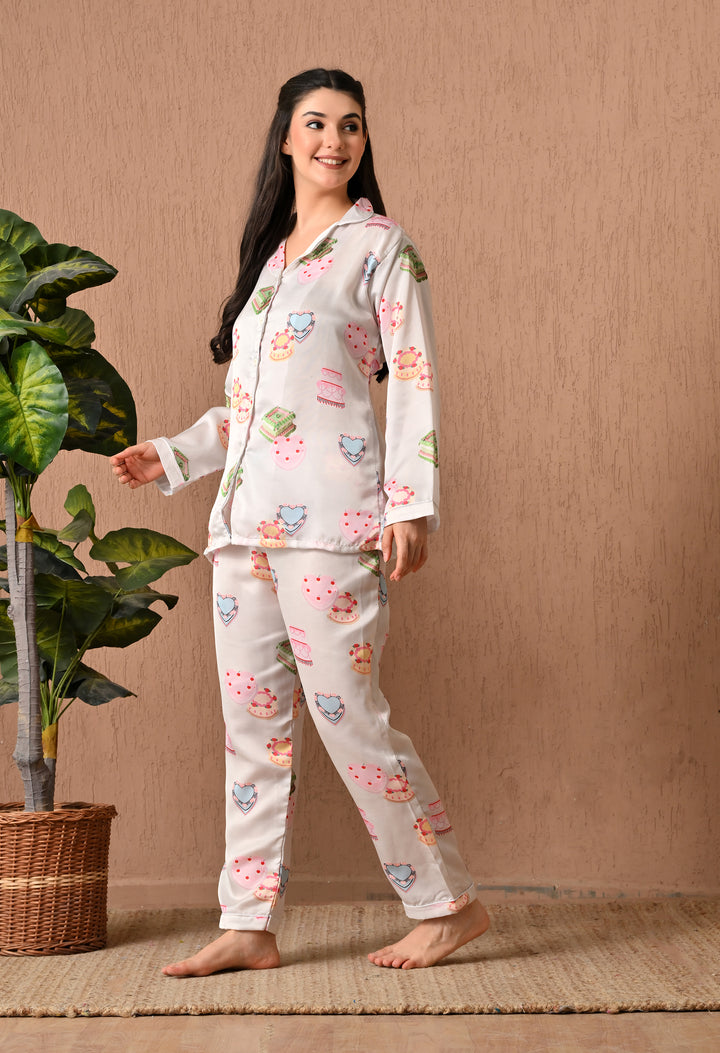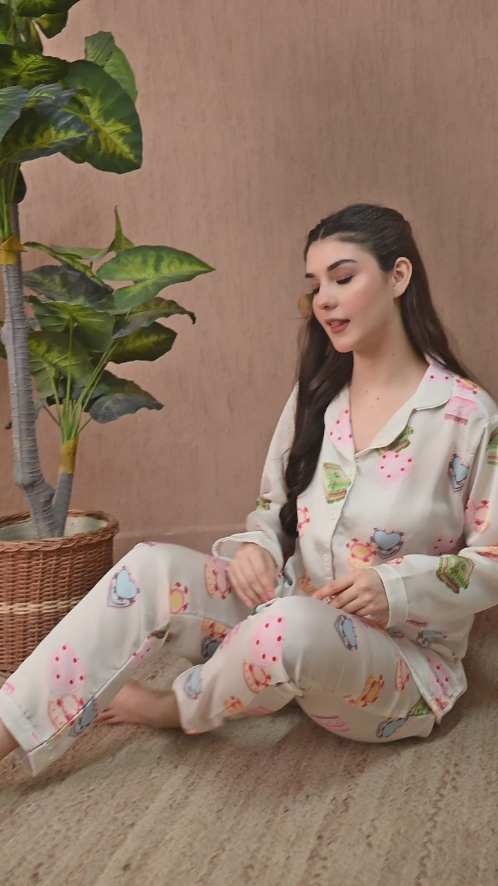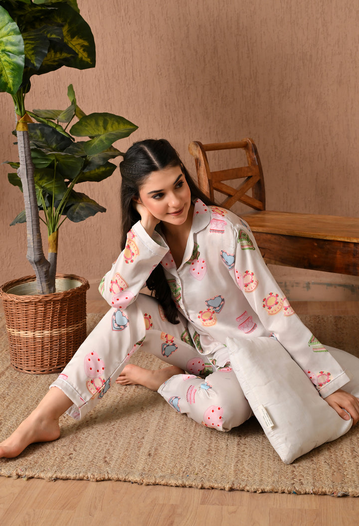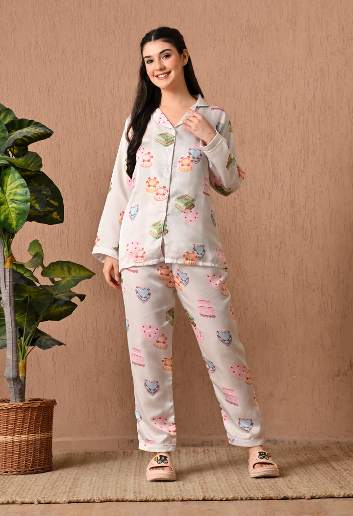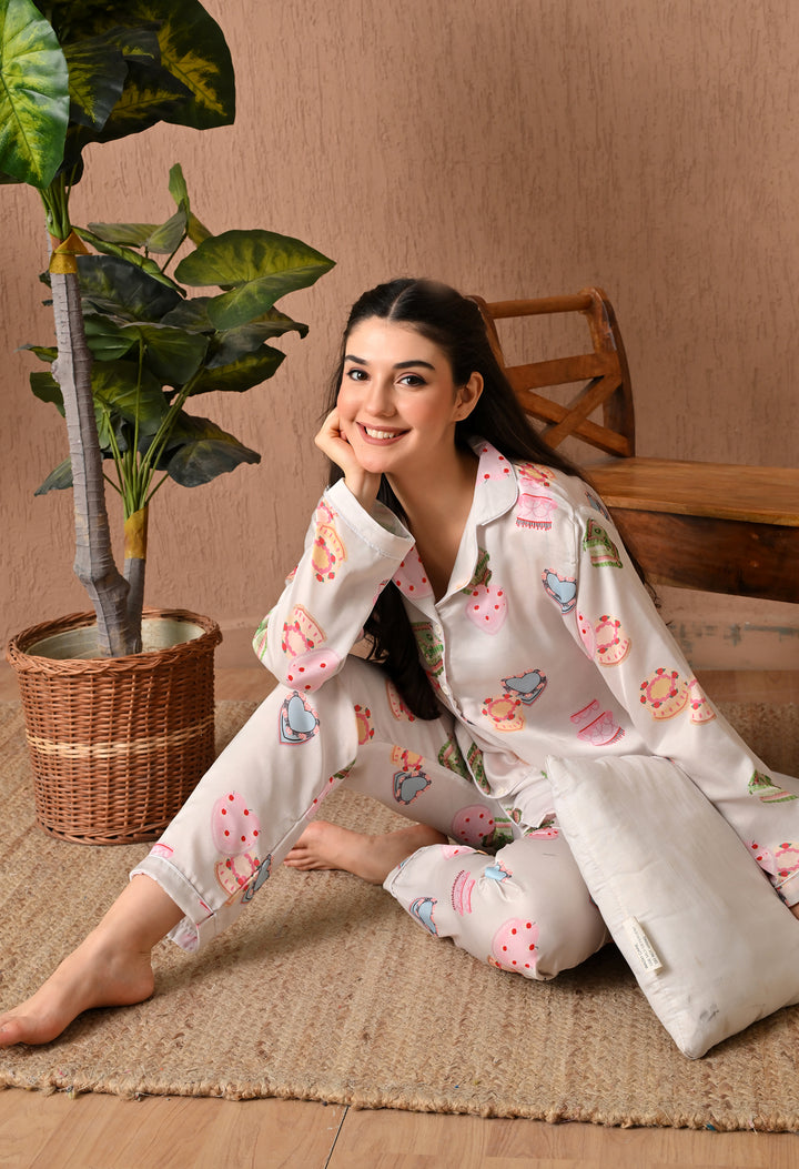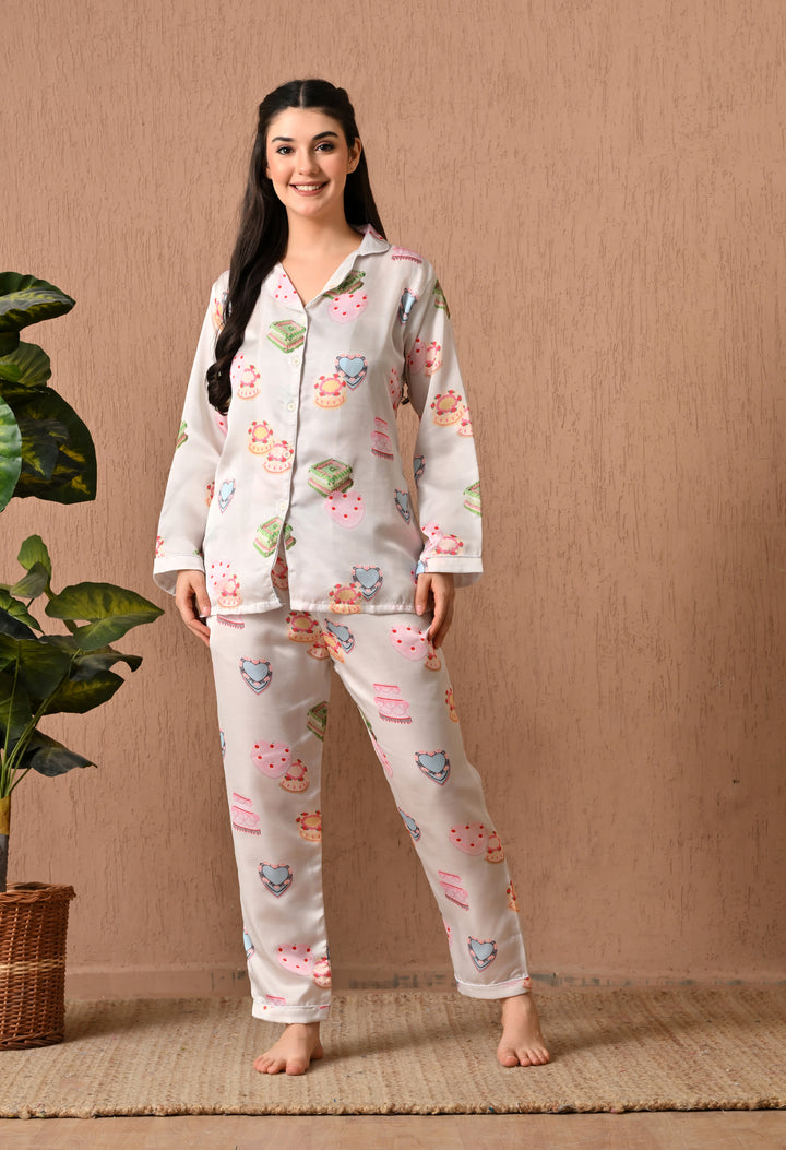 Drift into a world of comfort and cuteness with our Sweet Dreams Satin Set. Made from soft, silky satin, this night suit feels smooth on your skin and is perfect for peaceful sleep. The full-sleeve top comes with a smart collar and fun, colourful prints that add a playful vibe. The matching pyjamas are loose and comfy, making it easy to relax, sleep, or lounge in style. Whether it’s for bedtime or a lazy weekend morning, this night suit will be your favourite in no time!