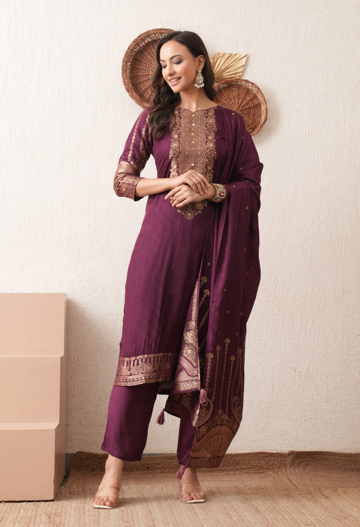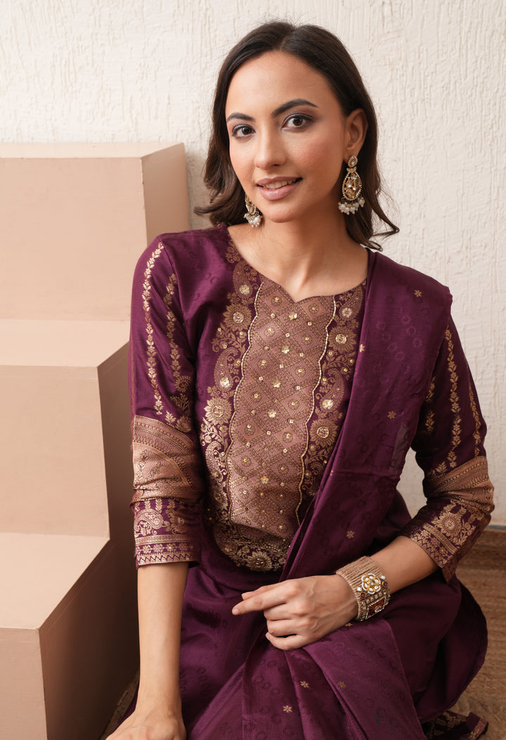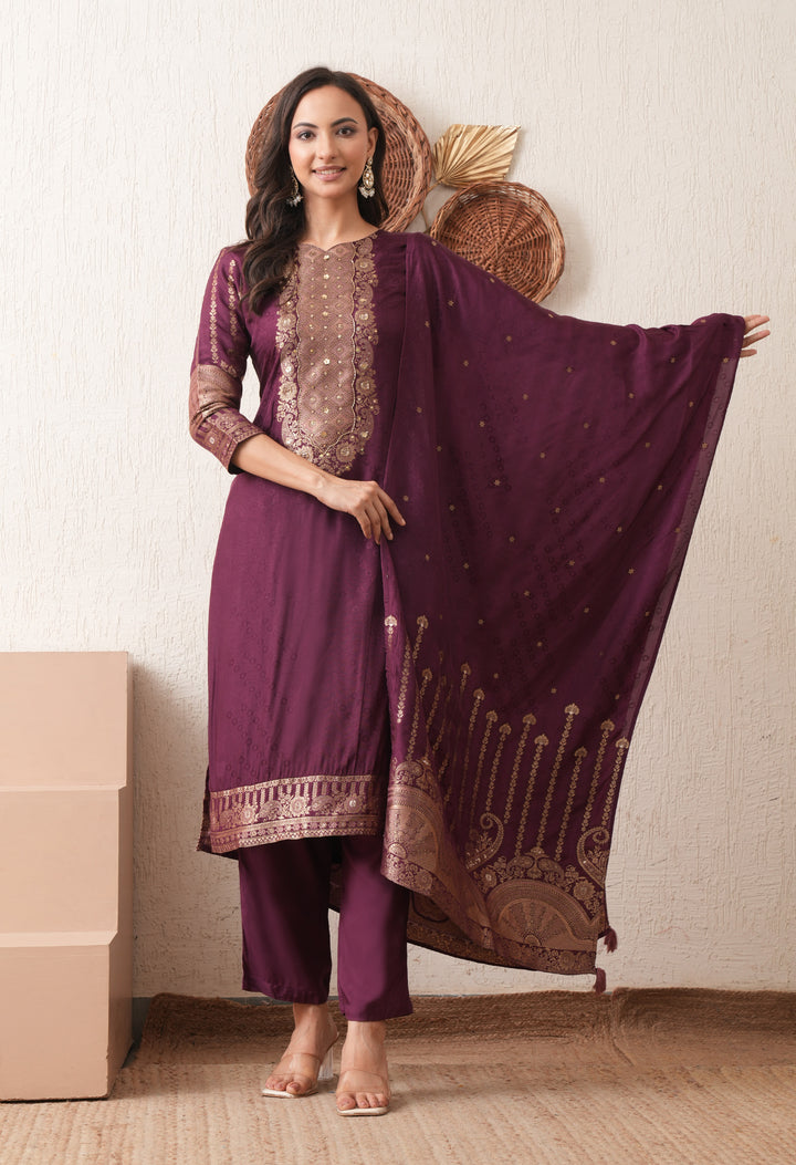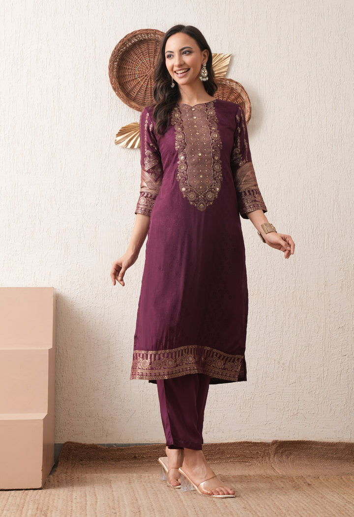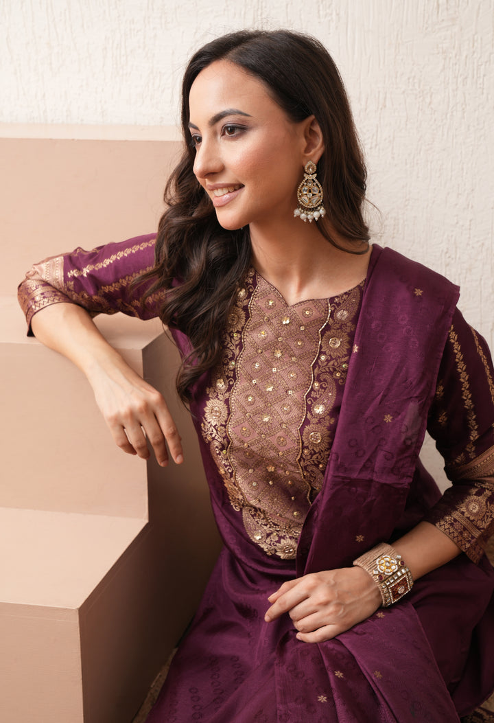 Turn heads with this stunning semi-formal suit in rich wine. Crafted from brocket silk, it features exquisite sequins, kutdana, and golden-pearl embellishments that add a royal charm. The paan gala neckline and 3/4th sleeves elevate its sophisticated appeal, while the matching Banarasi silk dupatta completes the look. Paired with sleek pants with a practical side pocket, this ensemble is perfect for parties and festive occasions. Fully lined for comfort and a flawless fit.