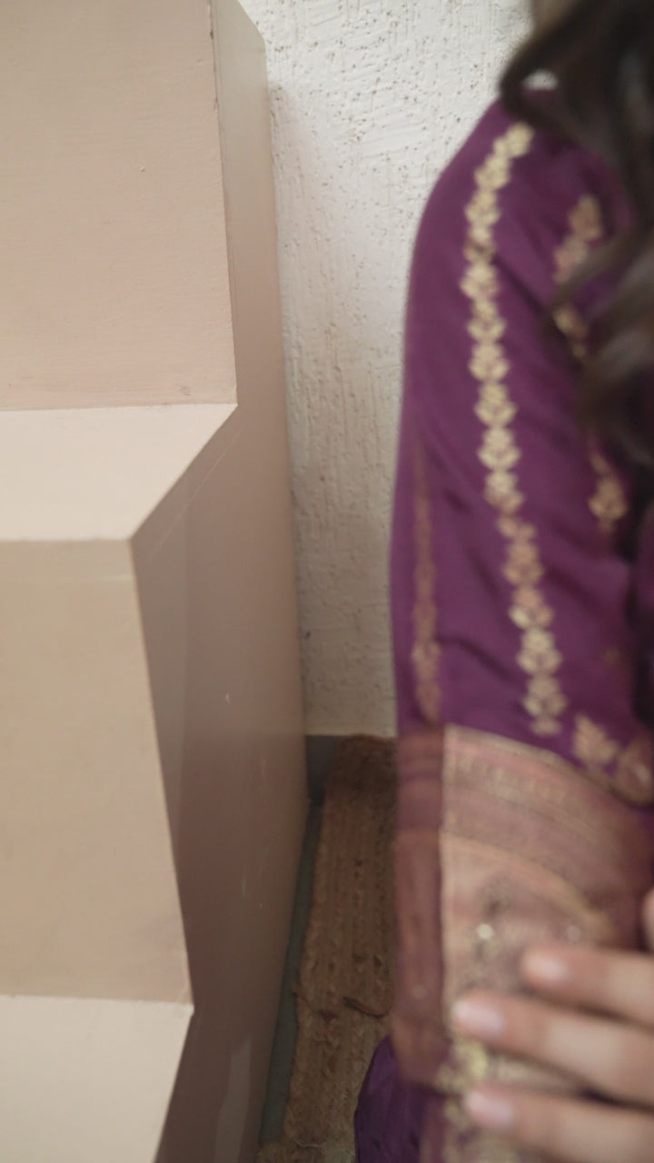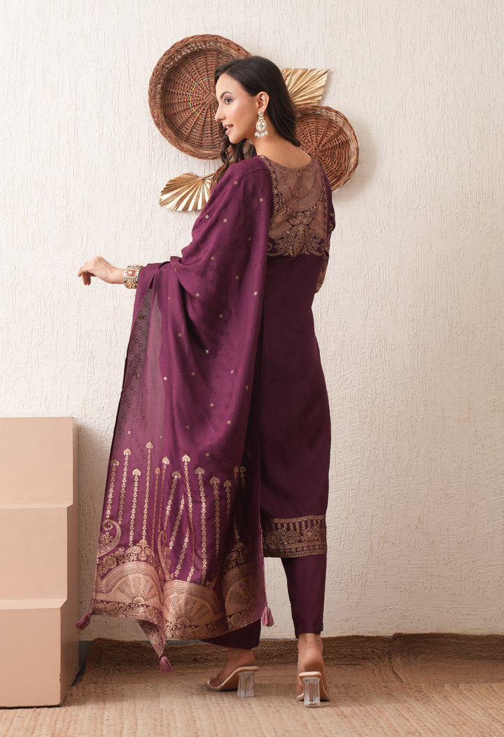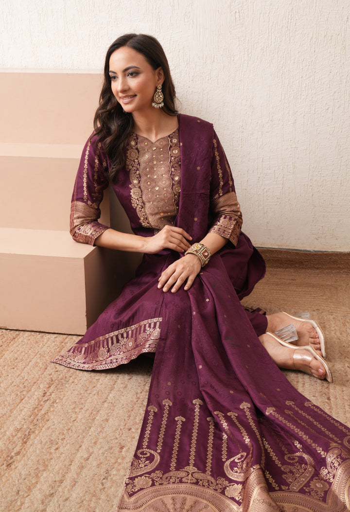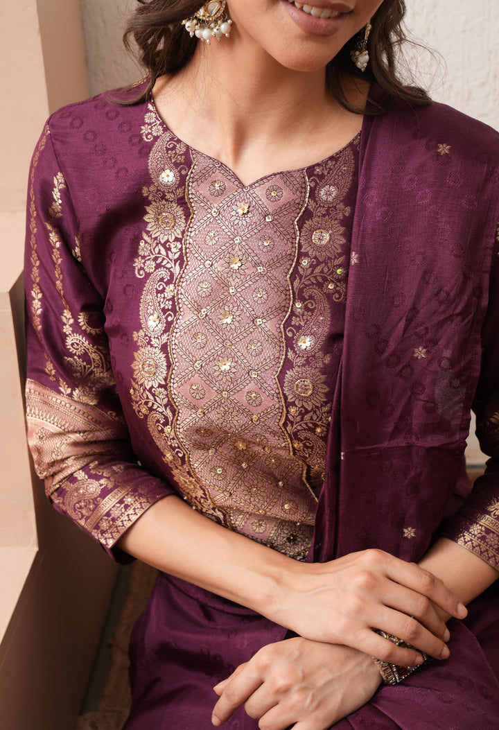 Turn heads with this stunning semi-formal suit in rich wine. Crafted from brocket silk, it features exquisite sequins, kutdana, and golden-pearl embellishments that add a royal charm. The paan gala neckline and 3/4th sleeves elevate its sophisticated appeal, while the matching Banarasi silk dupatta completes the look. Paired with sleek pants with a practical side pocket, this ensemble is perfect for parties and festive occasions. Fully lined for comfort and a flawless fit.